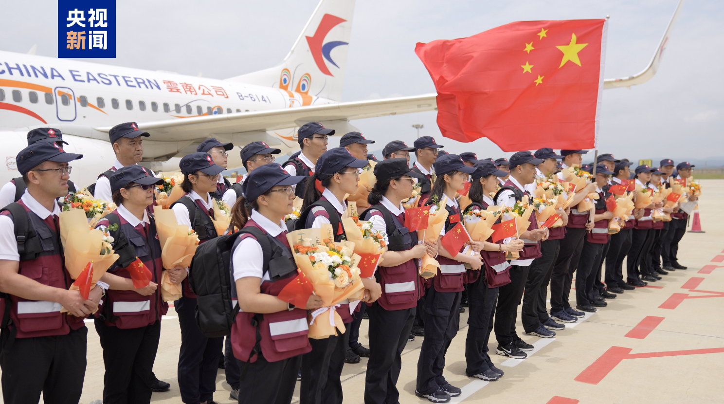 ▷18日,中国政府援缅卫生防疫队圆满完成为期一个月的援缅灾后卫生防疫工作,从缅甸仰光乘机抵达云南昆明。