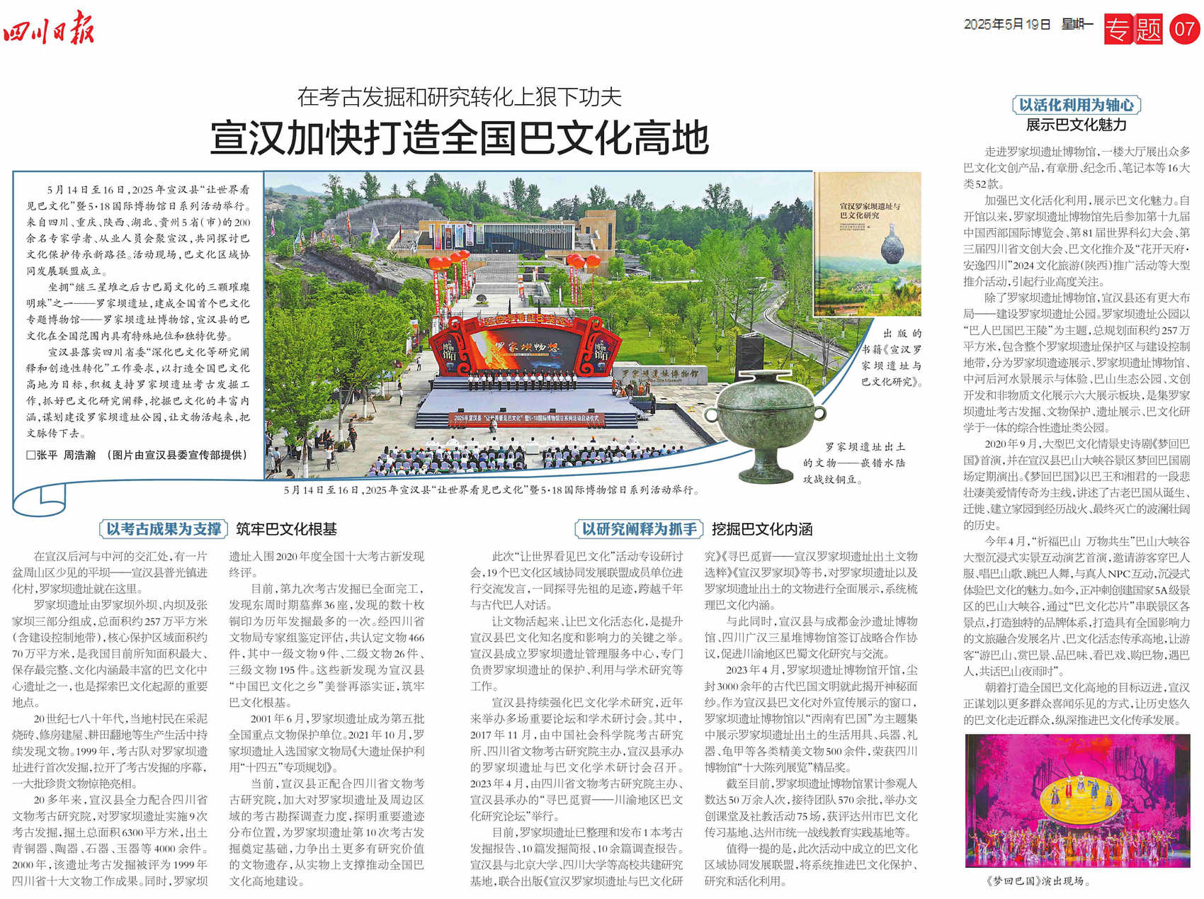 当前,宣汉县正配合四川省文物考古研究院,加大对罗家坝遗址及周边区域的考古勘探调查力度,探明重要遗迹分布位置,为罗家坝遗址第10次考古发掘奠定基础,力争出土更多有研究价值的文物遗存,从实物上支撑推动全国巴文化高地建设。