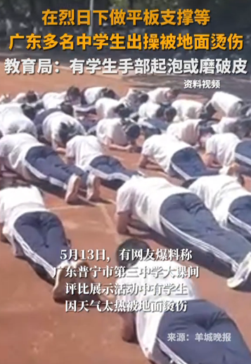 近日,广东普宁市第三中学的一则新闻引发热议。下午两点,该校组织高一年级学生在烈日下进行大课间评比展示活动,其中包括平板支撑等与地面直接接触的动作。由于当时气温高、地面滚烫,多名学生被烫伤,手部起泡甚至磨破皮。更令人不解的是,学校事后不仅未及时妥善处理,反而发布表扬信,称赞学生“没有一人退缩,没有一人抱怨”。