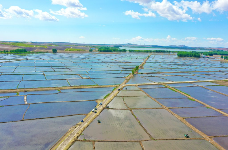 5月19日拍摄的内蒙古兴安盟突泉县东杜尔基镇明星村的稻田(无人机照片)。新华社发(王昊宇 摄)