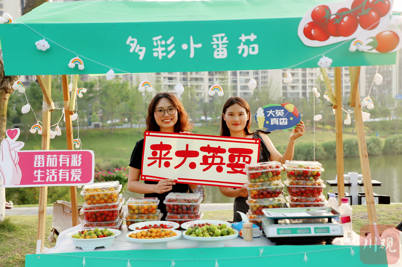 特色展区更显大英文化底蕴——久大盐业的展台上,各式盐制品为大英代“盐”;农产品展台上,回马镇的彩色番茄如宝石陈列,蔬菜面条以缤纷色泽吸引食客驻足。市集特别设置的文旅礼品互动区也笑声不断,团扇、香囊等礼品让市民游客参与感满满。