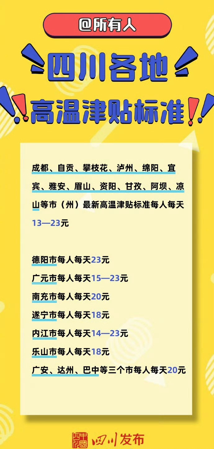 今年的“烧烤模式”已经开启,下月起,高温津贴也将正式进入发放期。四川各地高温津贴标准如下: