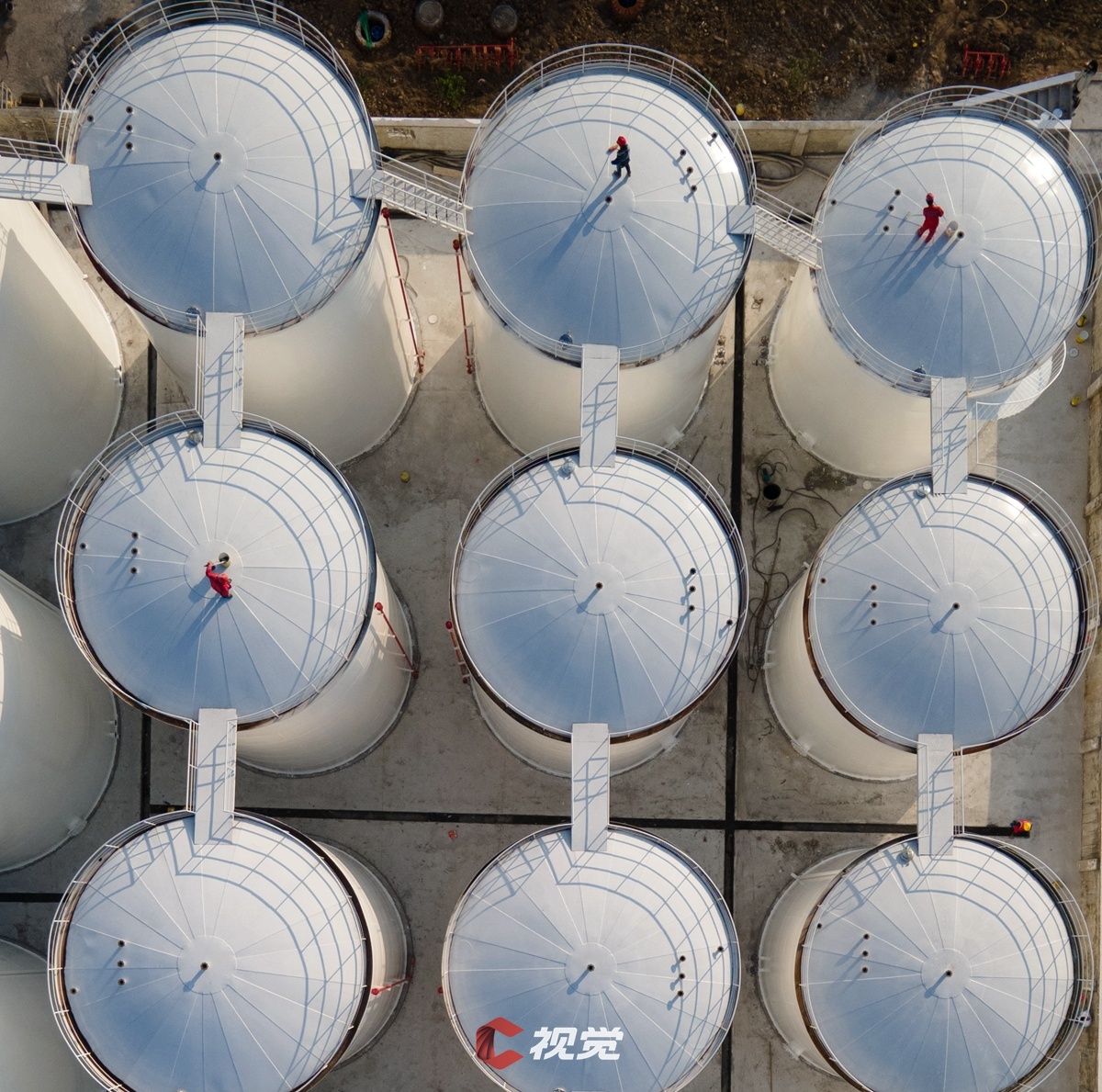 工人为广安市前锋区食用油综合深加工项目的油料储存罐群进行涂装。 C视觉签约摄影师 丁彦博 摄