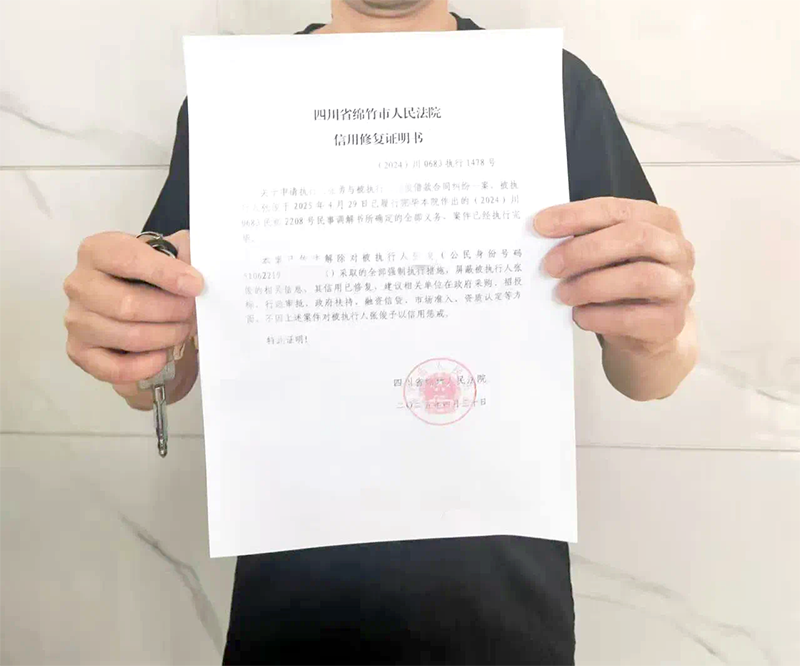 随着张某乙最后一笔款项的到账,案件圆满执结。法院随即解除对其的消费限制、屏蔽失信信息,并出具《信用修复证明书》。这份证明书对张某乙来说,意味着重生。他可以重新融入社会,享受正常的信用生活。