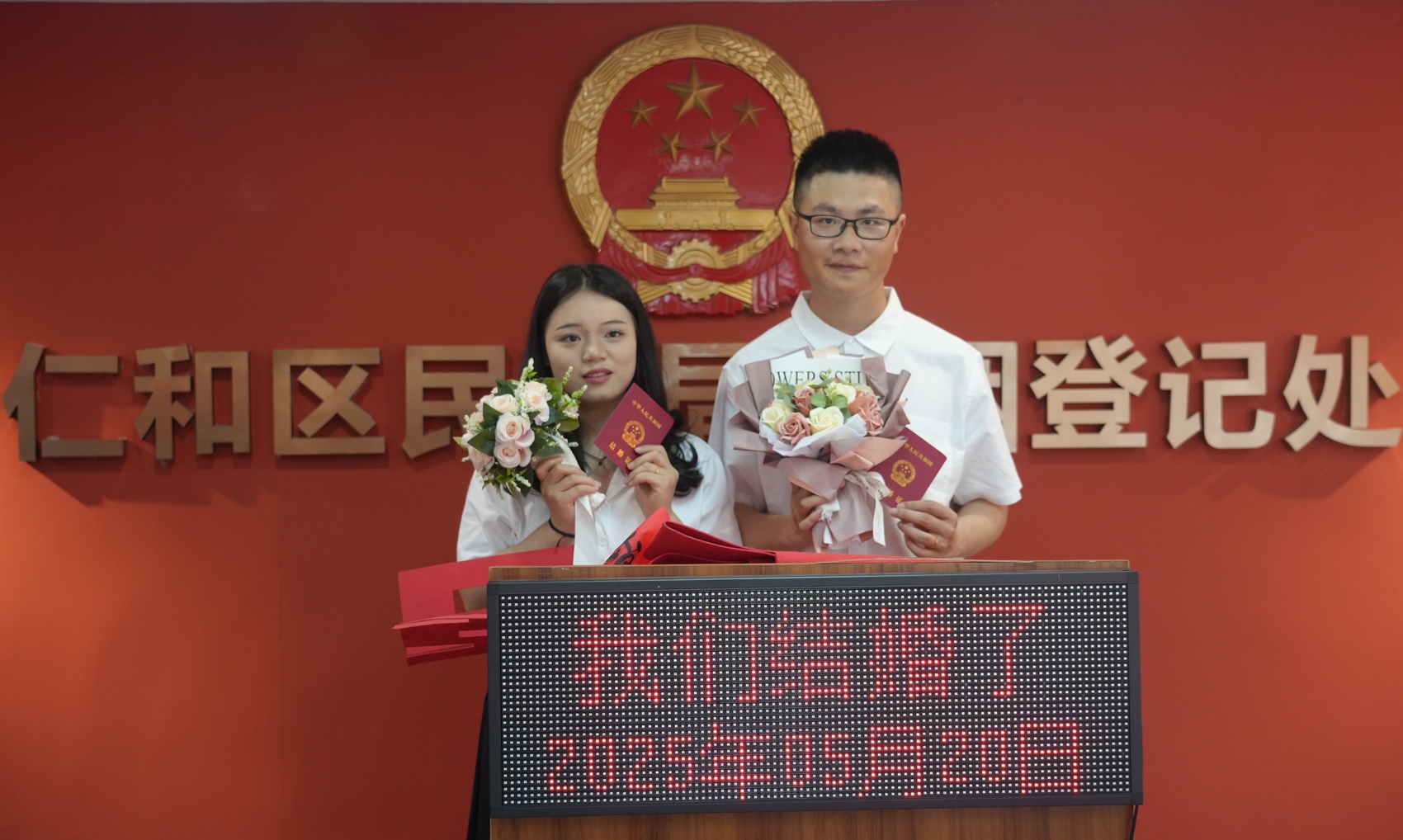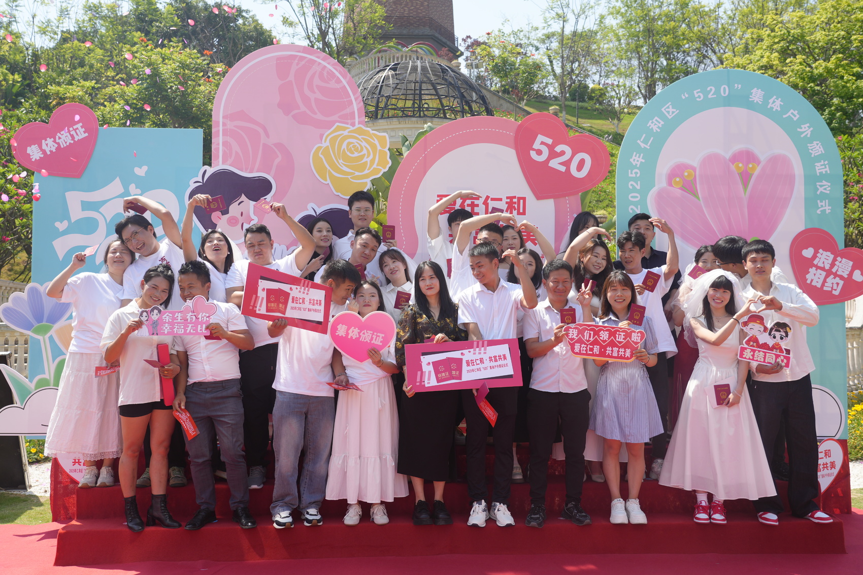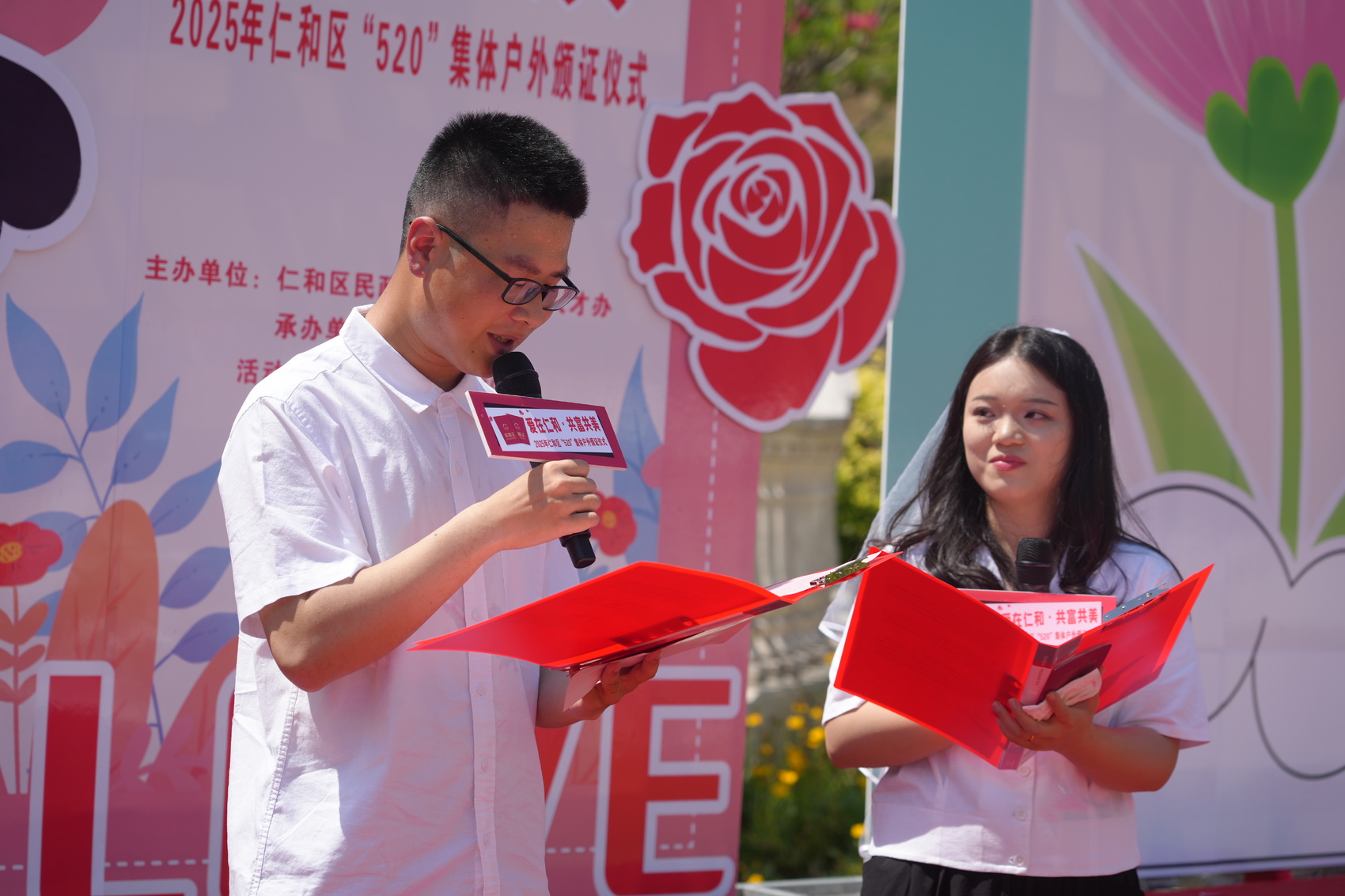 5月20日,因谐音“我爱你”成为新人结婚登记的热门日期。当天,攀枝花市仁和区民政局在普达阳光国际康养度假区举办“爱在仁和·共富共美”520集体户外颁证仪式,14对新人共同宣读结婚誓言,在亲友见证下完成人生重要仪式。其中,跨越6年异地恋终成眷属的新人史嘉洛、康琴的爱情故事,成为现场最动人的风景。