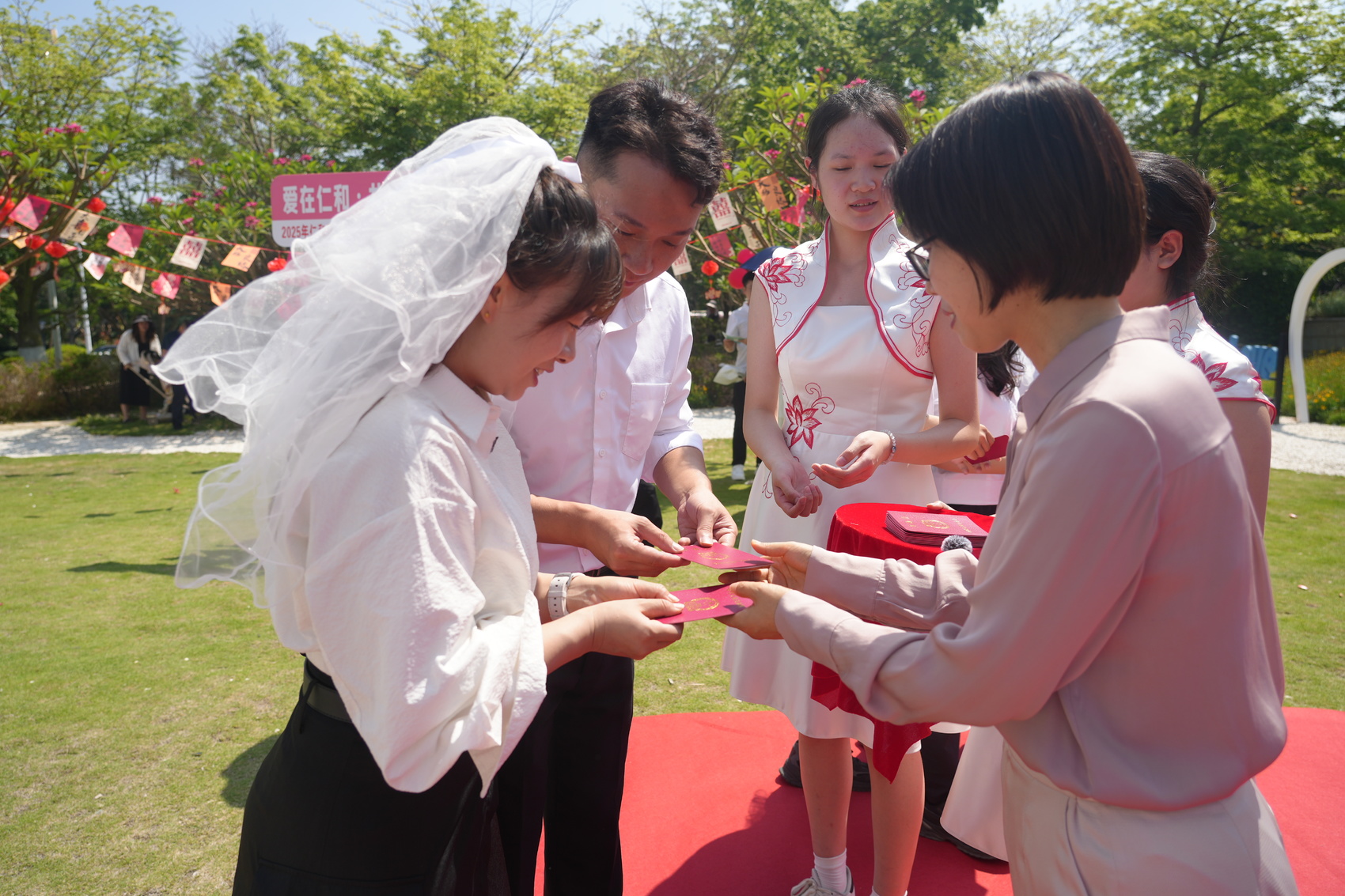 上午10点,普达阳光国际康养度假区的草坪上铺着红毯,红色气球拱门点缀其间。在仁和区民政局婚姻登记处完成法律登记后,新人们乘车抵达活动现场。仪式包含写婚书签名、按爱心手印、集体宣读《结婚誓言》等环节。当新人代表史嘉洛颤抖着双手接过结婚证时,台下响起热烈掌声。“这两页红本本,藏着一座城市与两个人六年的成长故事。”他在分享环节说道。