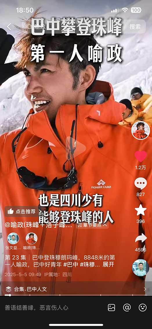 “巴中小伙子,好样的!”“让世界看见巴中!”“给咱们家乡人长脸了!”一时间,抖音和微信上的点赞声扑面而来。巴中抖音大V张文益(@张文益的地历经)与喻政共创发布了一则登顶双峰的视频,张文益在视频中说:“喻政攀登的不仅是珠峰,更是所有怀揣梦想者心中的精神高峰。”该视频获得了近百万的浏览量和1.2万点赞,且热度持续上涨。