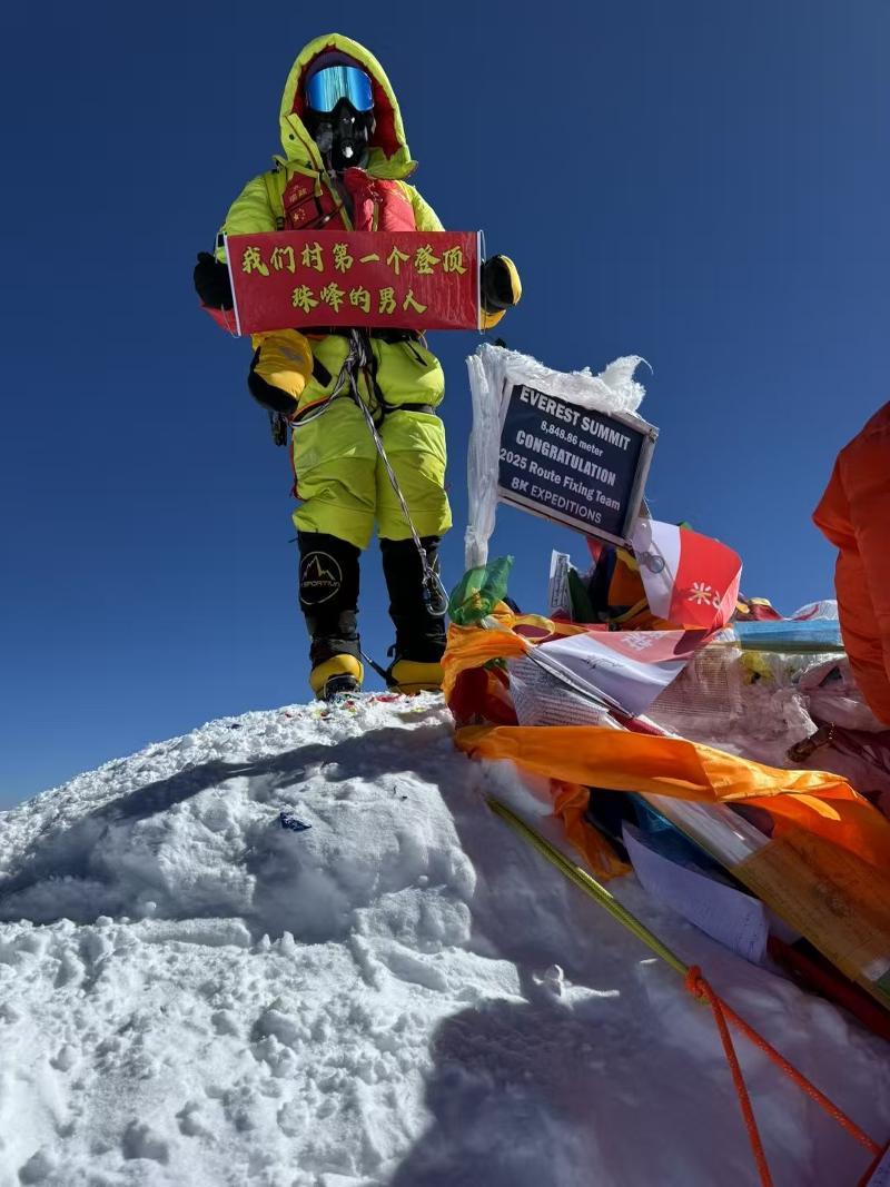 登顶视频里,喻政举着家乡网友为他制作的横幅“我们村第一个登顶珠峰的男人”,鲜艳的五星红旗在风中飘扬。