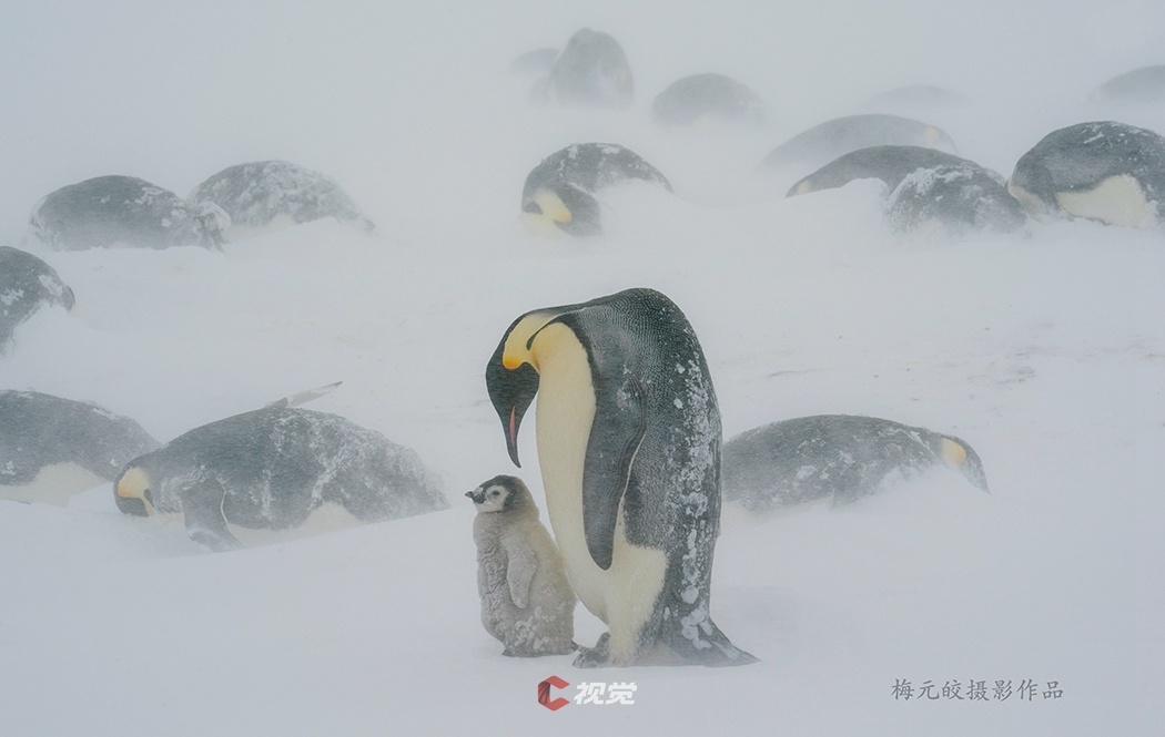 2019年11月,在南极本岛拍摄帝企鹅的经历,是他摄影生涯中非常难忘的一次。“一般的人去拍帝企鹅,那个行程是三天。我们遇到暴风雪,飞机飞不回,困了8天。准备的东西都快要吃完了,但是我很高兴。”因为这场暴风雪,原本有瑕疵的拍摄场景变得洁白无瑕,企鹅群在暴风雪中抱团抵御极寒的坚韧、企鹅的各种灵动瞬间均被他一一捕捉。“尽管气象条件恶劣,但于我来说是‘幸运’,它们的生存本身就是极致的美学。”梅元皎说。