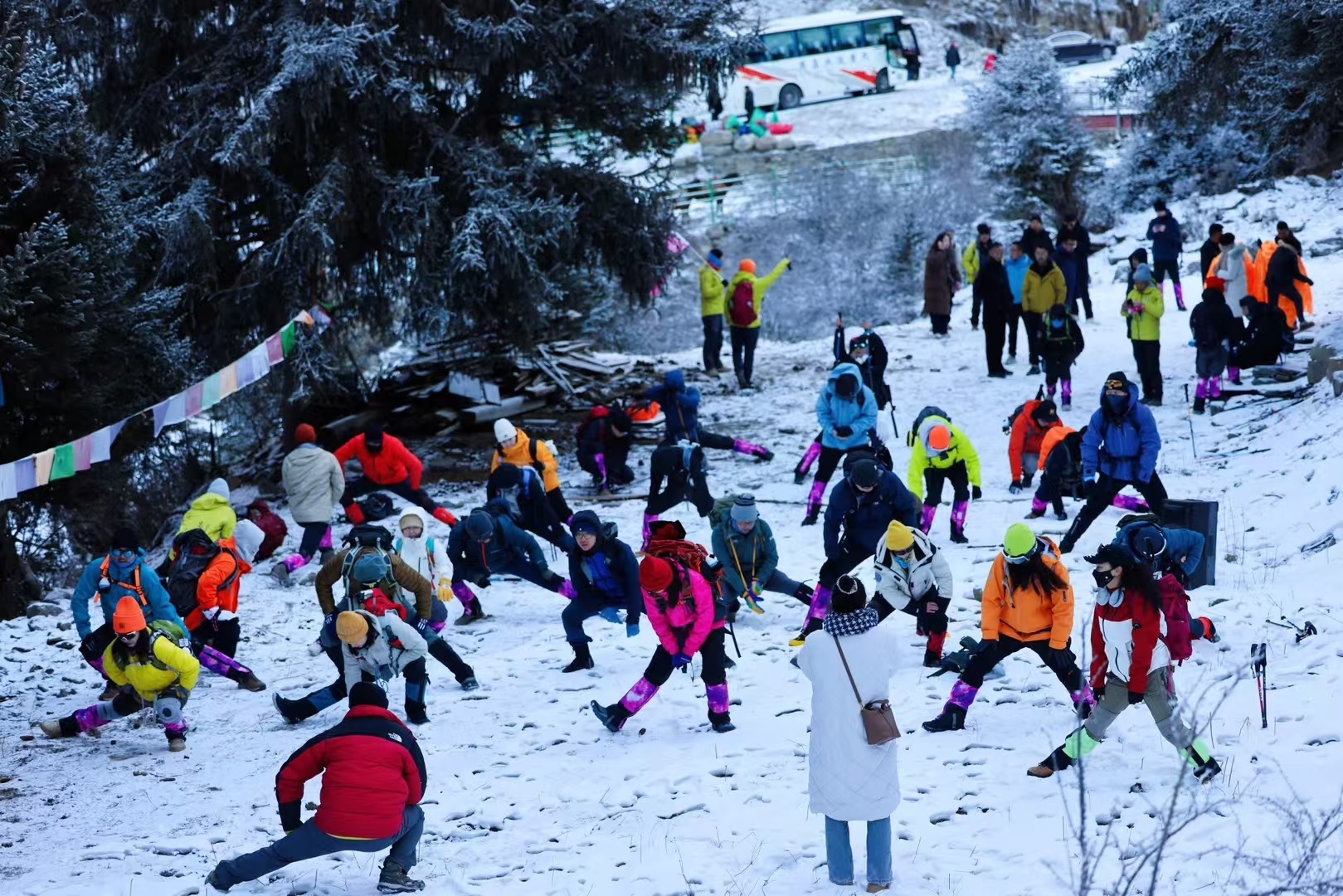 雪山攀登前,登山者进行准备活动。来自驴足迹户外旅行俱乐部