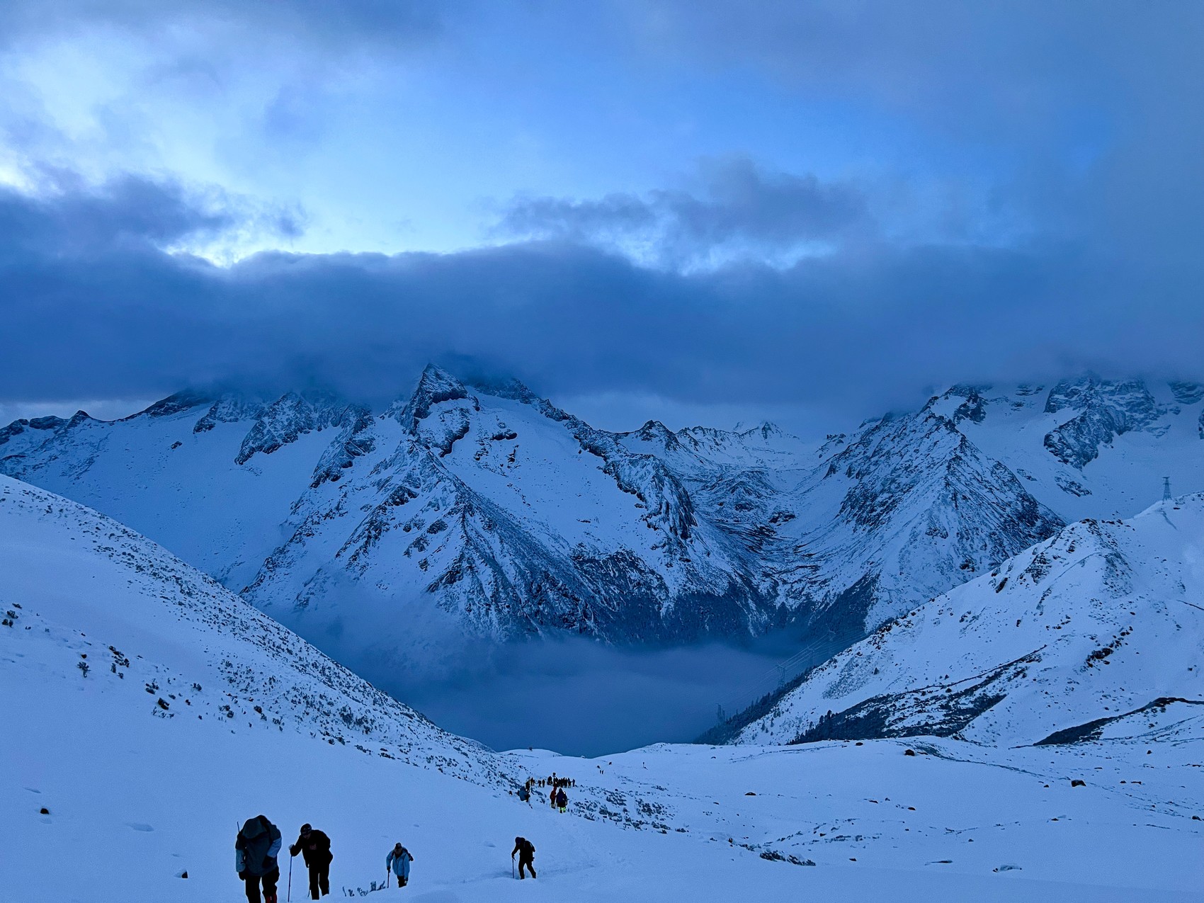 登山者在雪山中行进。来自晨星破晓户外俱乐部