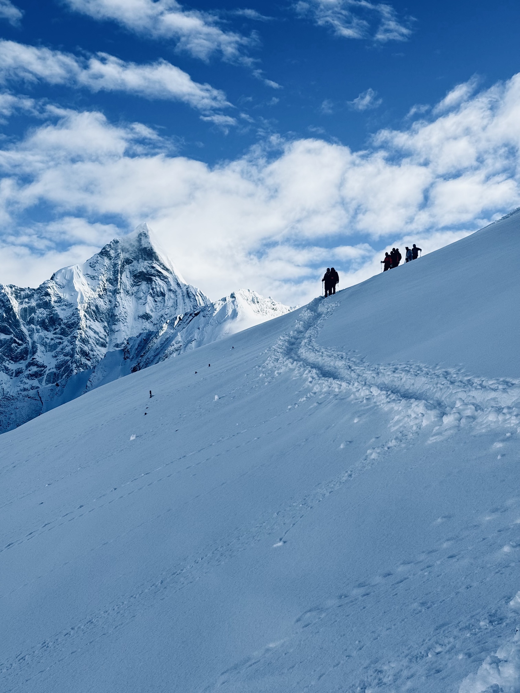 登山者在雪山中行进中蹚出身后的轨迹。来自晨星破晓户外俱乐部