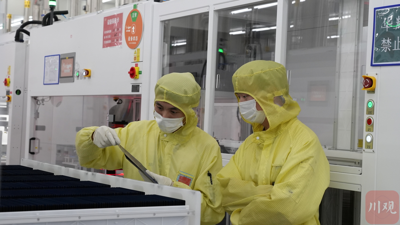 位于宜宾高新区的光伏电池生产基地内,工作人员检查制成品的工艺细节。 罗顺 摄