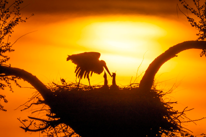 在黑龙江扎龙国家级自然保护区克钦湖,东方白鹳在晨光中哺育雏鸟。