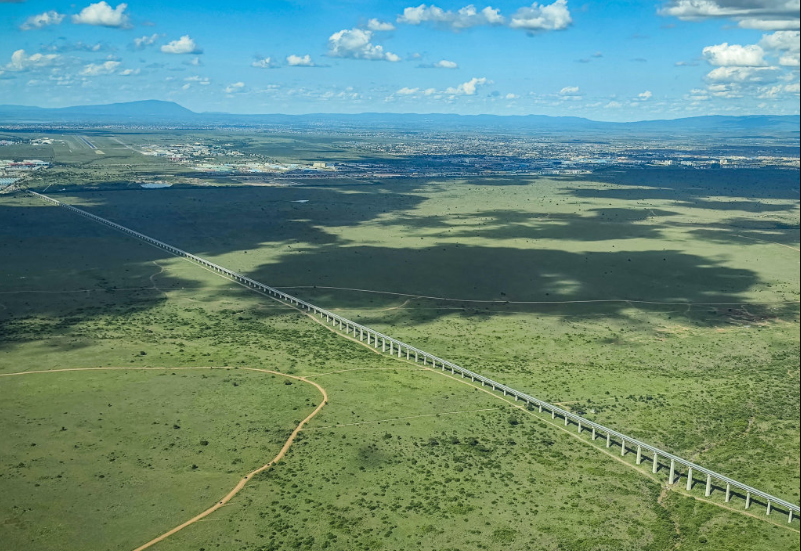 这在肯尼亚内罗毕国家公园上空拍摄的穿越公园的内马铁路一期大桥。