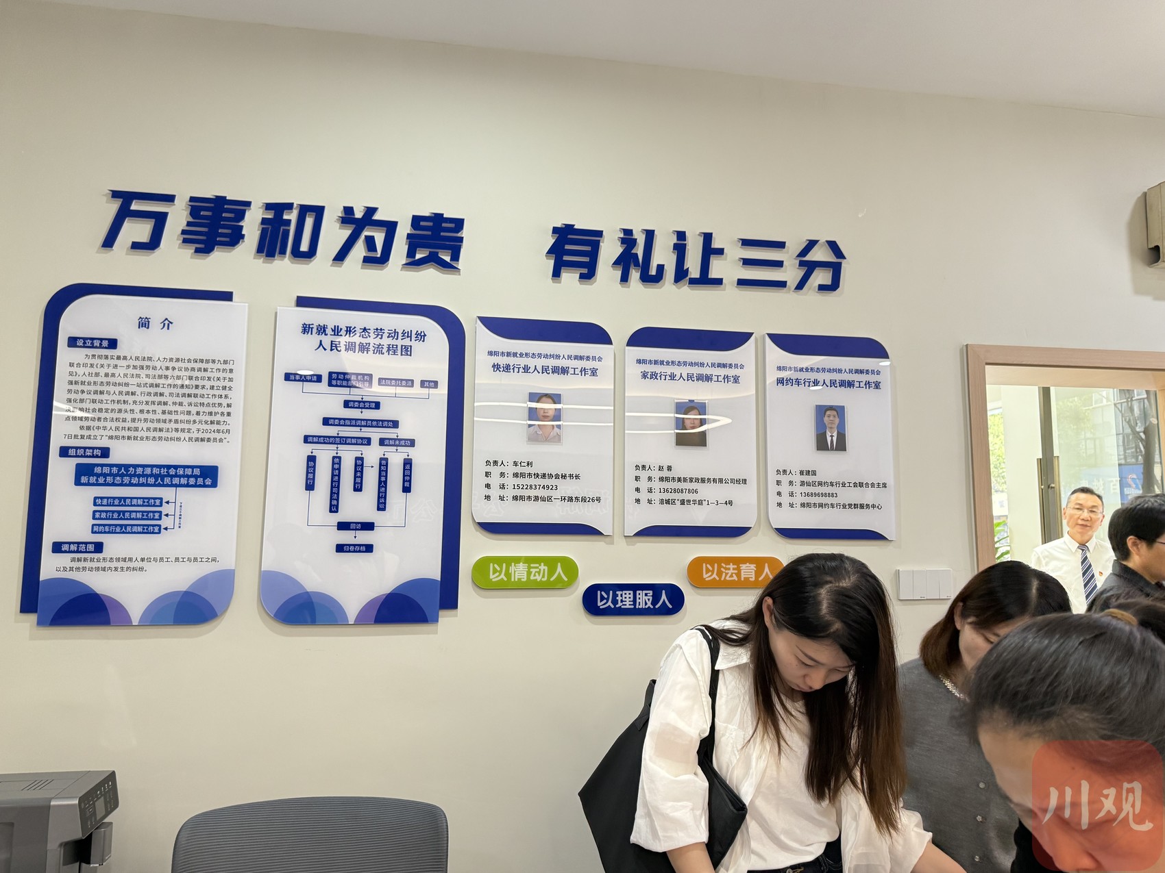 绵阳市劳动和就业权益保障公共服务大厅,也是联合调解中心所在地。走进大厅一楼的调解室,墙壁挂着新就业形态劳动纠纷人民调解流程图,快递行业、家政行业、网络约行业三个人民调解工作室负责人的姓名、照片、职务、电话、办公地址等信息,也在墙上清晰公示。