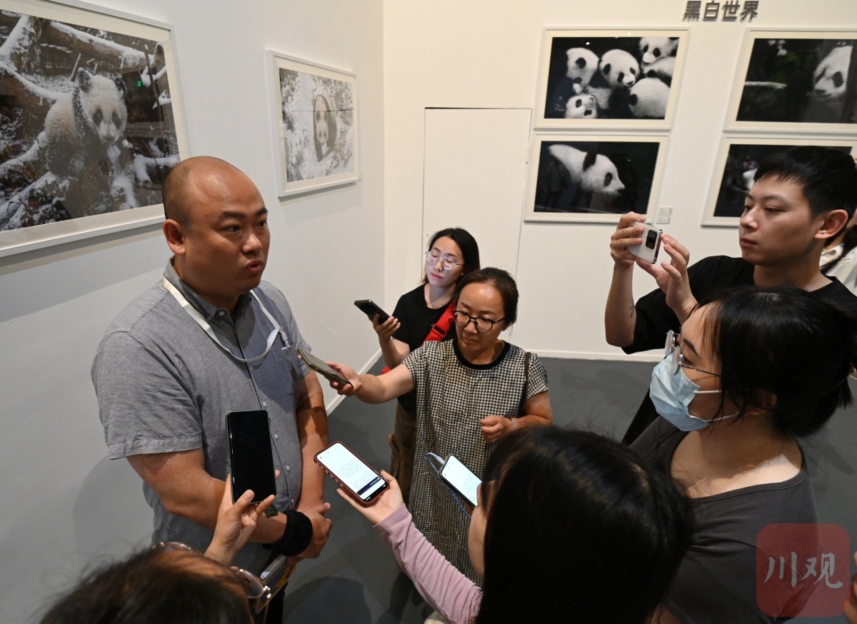 开展当日,周孟棋化身讲解员,以《悄悄话》《熊猫太极》等作品为切入点,分享镜头背后的生态观察 —— 在《悄悄话》中,三只大熊猫自然互动的憨萌场景,是数小时静候中捕捉到的 “不摆拍的真实”,既展现物种独特的社交行为,也传递出 “最小干预” 的保护理念;《熊猫太极》里,蜷成圆团酣睡的熊猫与传统文化符号的奇妙契合,则以艺术化视角揭示自然与人文的共生哲学。
