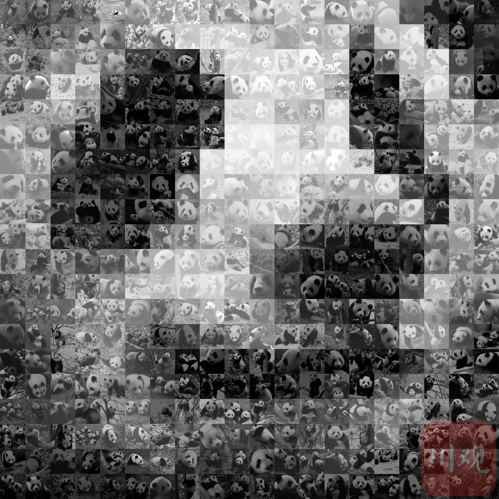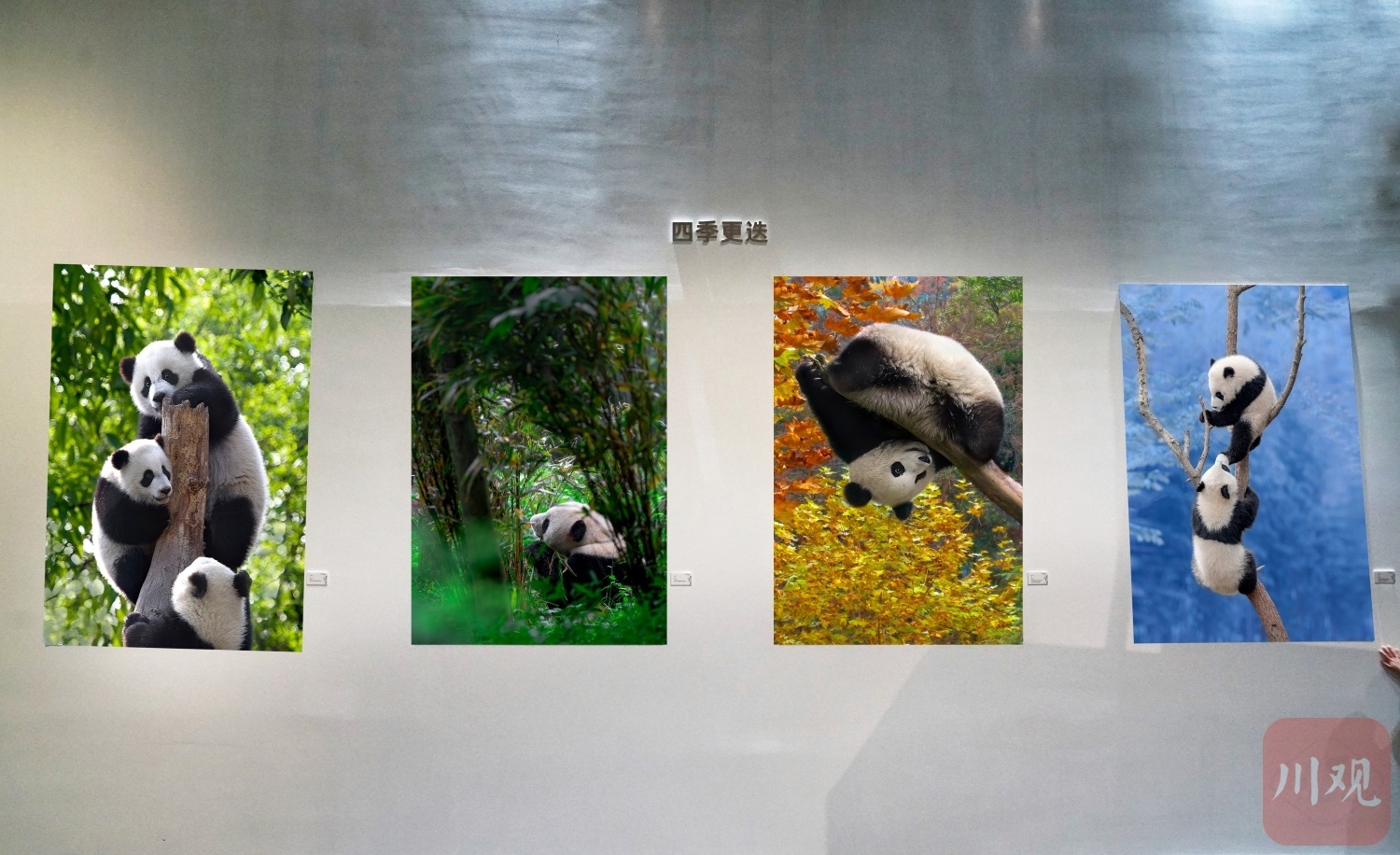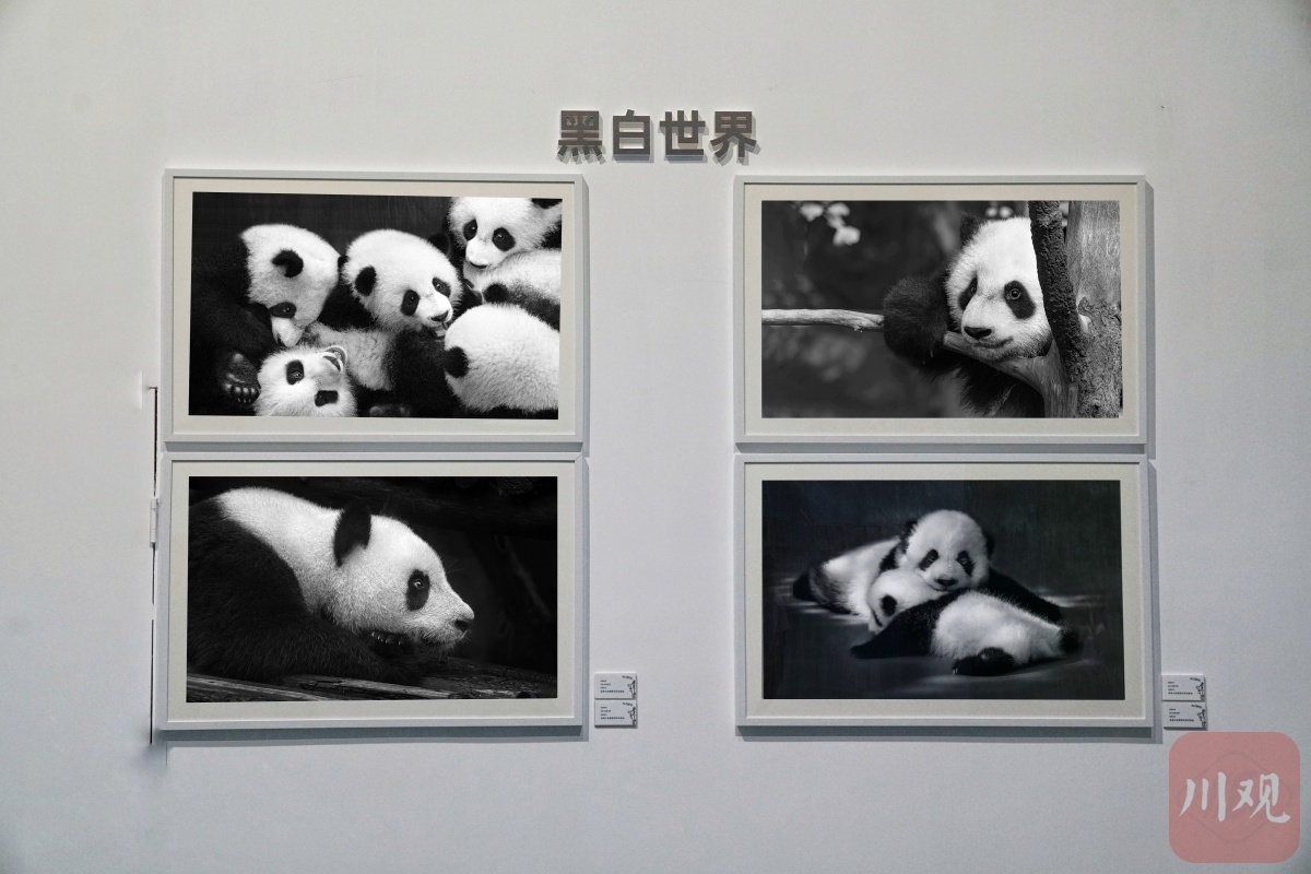 周孟棋的镜头如同 “会说话的观察者”,不仅聚焦熊猫的 “七情六欲”,更通过眼神、肢体语言的细腻刻画,让观众看见人类与自然的深层联结。展墙上,熊猫花花、和叶、萌兰等 “明星熊猫” 的萌照吸引众多亲子家庭驻足,而由四百幅照片拼贴而成的《百态归一》尤为引人深思:远观是大熊猫标志性头像,近看则是不同季节、姿态、环境下的个体写真,黑白灰影调暗合 “阴阳和谐” 理念,恰似对 “万物共生” 的视觉化诠释 —— 千般姿态归于自然本真,每个物种都是生态系统的独特音符,唯有守护多样性,方能奏响 “和美永续” 的共生乐章。