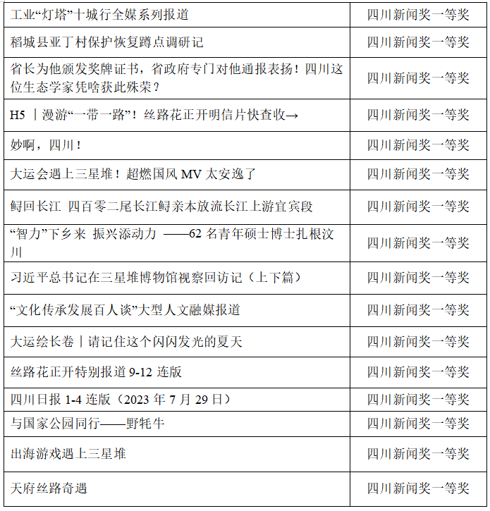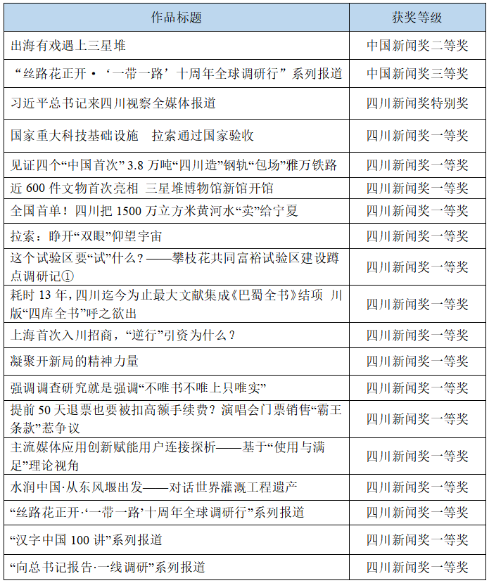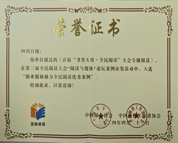 2024年,在第三十四届中国新闻奖评选中,四川日报全媒体2件作品获奖。在四川新闻奖评选中,59件作品获奖,其中1件作品获特别奖,32件作品获一等奖。研究成果《智媒大模型》荣获中国报业协会“2023-2024年度全国媒体融合技术应用案例一等奖”。《中国式现代化100问》,获四川省第十七届精神文明建设“五个一工程”优秀作品奖(理论文章类)。四川日报全媒营销中心荣获“四川省三八红旗集体” 。