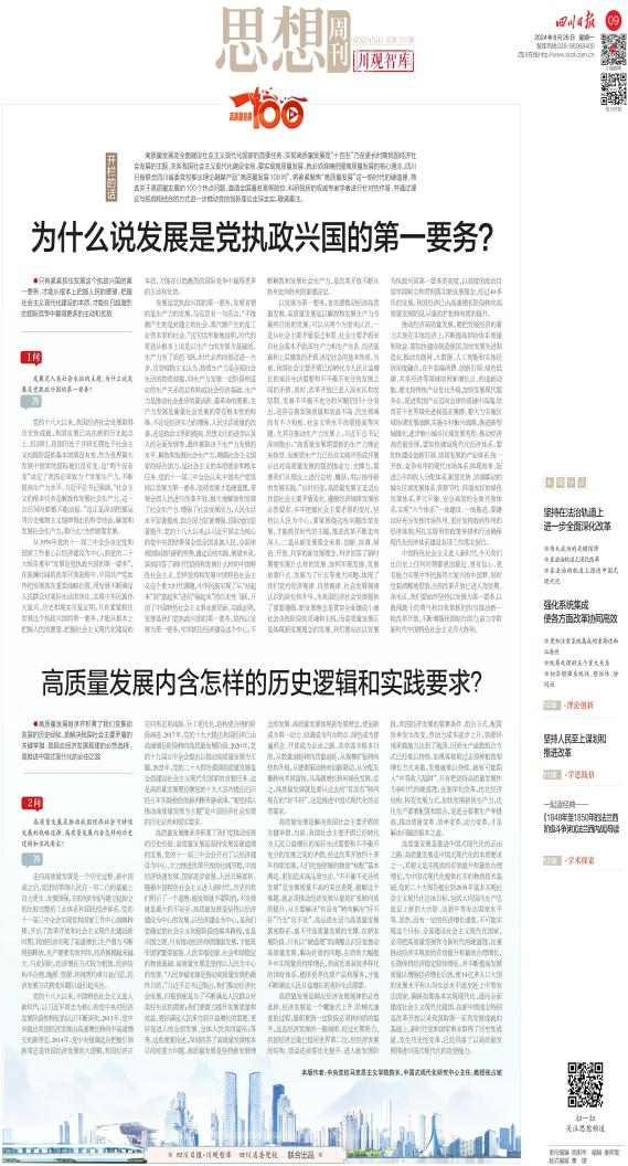 持续加强党的创新理论阐释。在党媒理论周刊中率先开设“学习”专栏,推出《跟着总书记学典故》《一起学习吧!》第二季,创新阐释习近平新时代中国特色社会主义思想。“中国式现代化100问”收官并结集成书,荣获四川省第十七届精神文明建设“五个一工程”优秀作品奖。持续打造“100问”理论品牌,联合四川省委党校推出理论融媒新产品“高质量发展100问”。