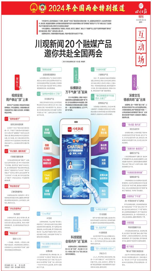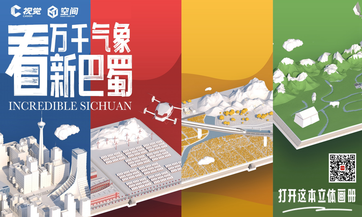 (2024年全国两会期间,川观新闻推出3D新媒体产品《打开这本立体画册,看万千气象新巴蜀》。这件原创作品依托2万个三维模型搭建、20个点位组成的3D场景,将四川的创新科技、现代产业体系、乡村振兴和生态环境治理等发展变化在这本立体画册里一一精彩呈现,产品全网传播量超千万人次。)