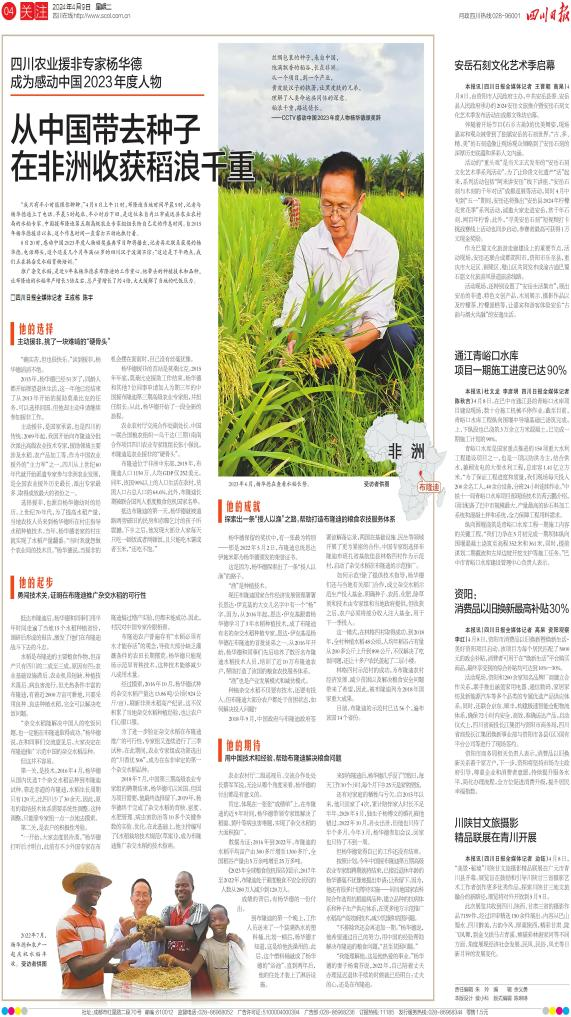 四川日报始终秉持“以人为本”精神,宣传好优秀楷模、激发向善力量。开设“兴川榜样·先锋力量”专栏,立体呈现新时代四川先锋榜样群体。采写报道跨越山海、将壮丽生命定格在巴蜀大地的王峻,浴血擒凶守护平安的全国公安系统一级英雄模范蒋久华,绽放金色山川的高原玫瑰—阿坝州金川县咯尔乡德胜村驻村第一书记何小青,感动中国2023年度人物—四川农业援非专家杨华德等一批可敬、可爱、可亲、可感的正能量暖心人物,以鲜活的故事弘扬正能量、鼓舞人心,弘扬社会主义核心价值观。