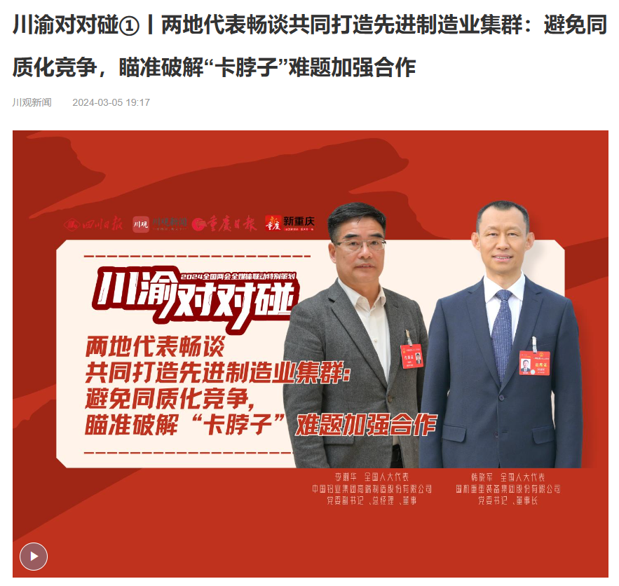 (2024年全国两会期间,四川日报全媒体、重庆日报全媒体联合推出“川渝对对碰”策划报道。邀请两地代表委员展开隔空视频“对话”。报道集川渝之智,聚焦川渝两地共同打造先进制造业集群、共建以人为核心的新型城镇化示范样板、推动“川渝通办”提质扩面三大主题,寻求未来的发展方向与路径。)