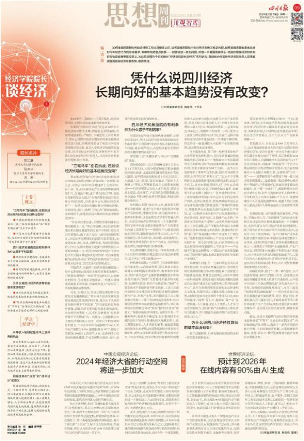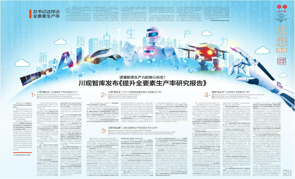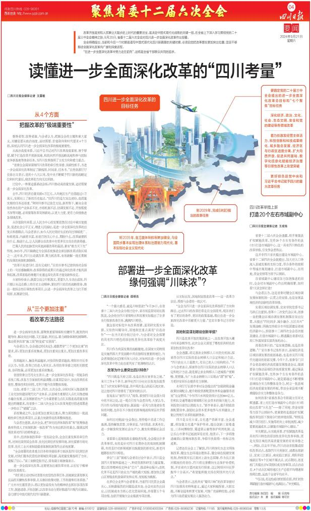 精准解读中央和省委省政府最新政策和权威信息。开设“推进城乡融合发展调研行”等专栏报道,打造“省情研究所”等精品栏目,推出《绘制向“新”求“质”新蓝图》《经济大省挑大梁》《读懂新质生产力的核心标志!川观智库发布<提升全要素生产率研究报告>》《读懂进一步全面深化改革的“四川考量”》等深度解读,帮助读者了解一个个站高谋远决策出台的思路和逻辑,更好地掌握中心思想。