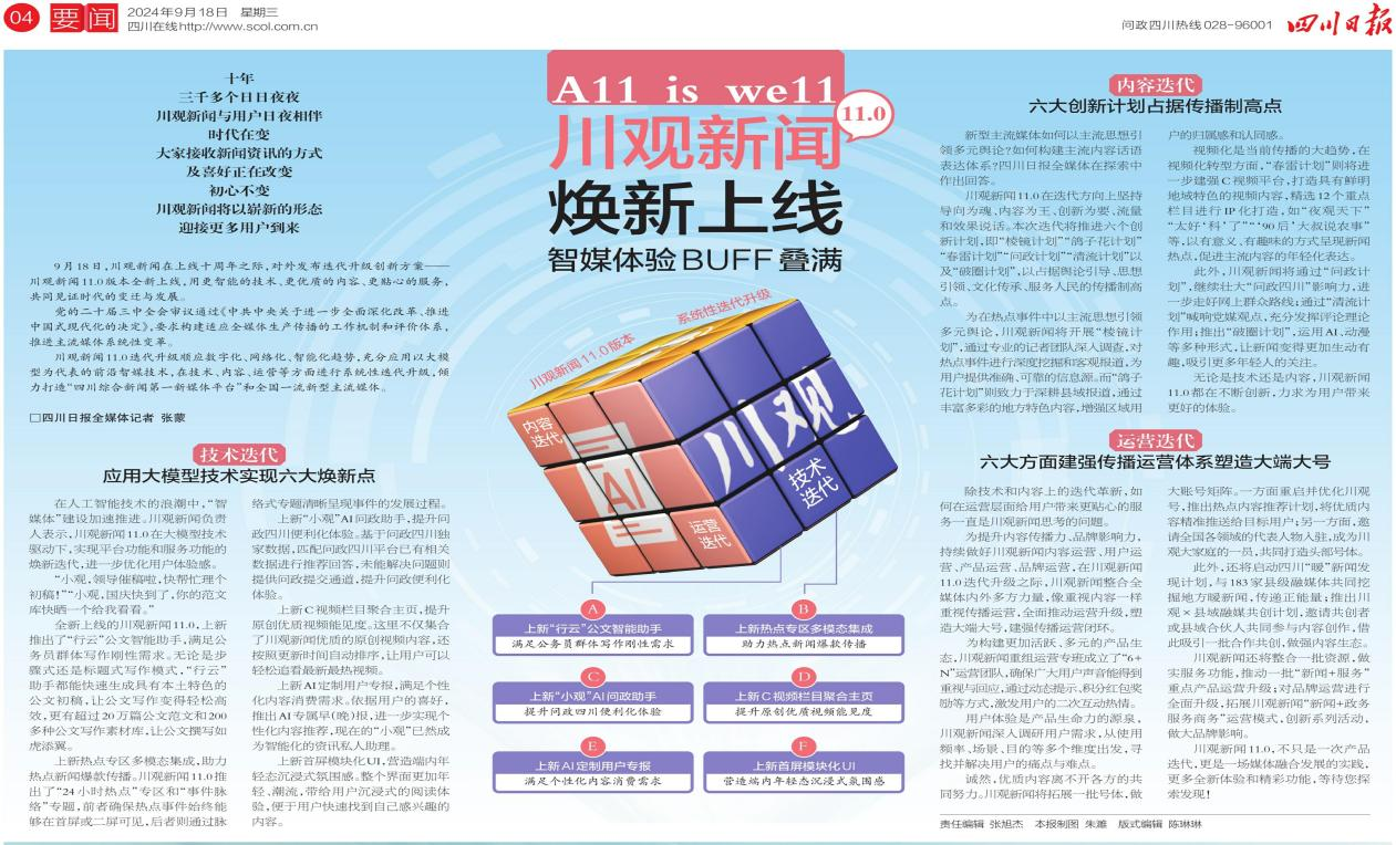 (以大模型技术驱动的川观新闻11.0版,在技术、内容、运营等方面进行系统性迭代升级,产品实现六大焕新迭代。)