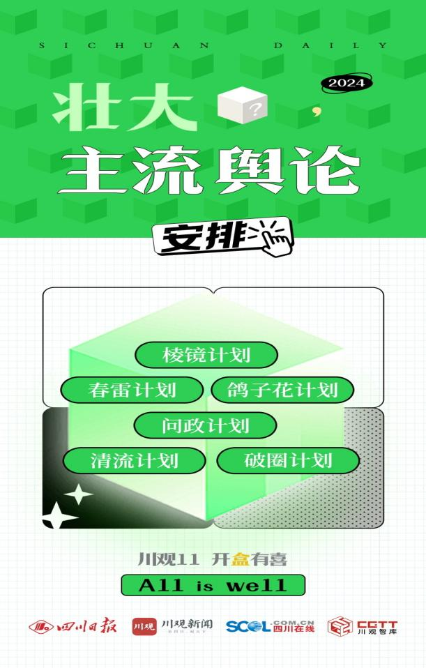 坚持以内容建设为根本,持续提升舆论引导力。川观新闻客户端推进实施“棱镜计划”“春雷计划”“鸽子花计划”“问政计划”“清流计划”“破圈计划”,壮大移动传播阵地。加速建设一流新型媒体智库,成立川观智库学术委员会,构建川观智库“1+N”架构。2024年新增“共富”“问稻”“法治”“文旅”等主题单元,推出《问道改革先行区·科技创新篇》系列调研报道,发布《数据背后看新“县”象》《关于发展新质生产力的“解惑”报告》等近百个高质量智库产品。实施“川观新闻鸽子花内容共创计划”,收到市县融媒体中心共创内容420件。