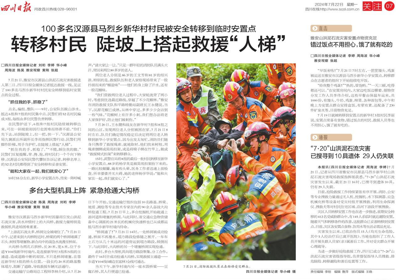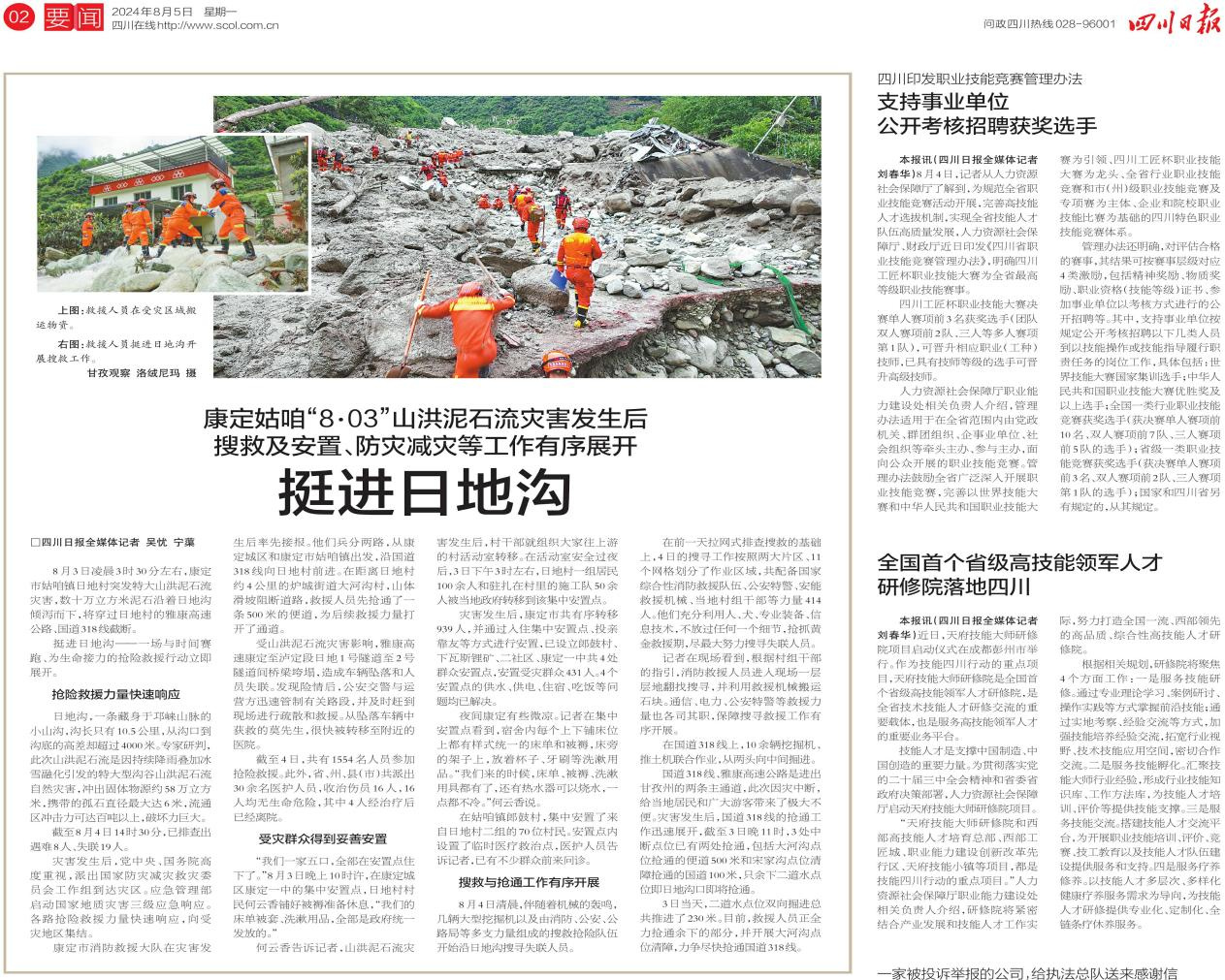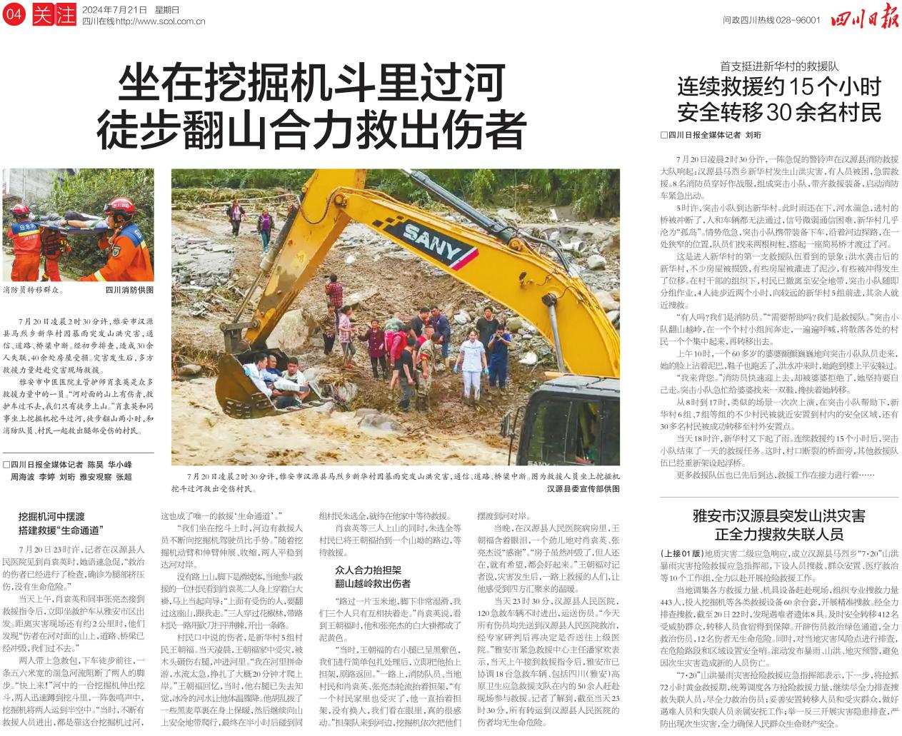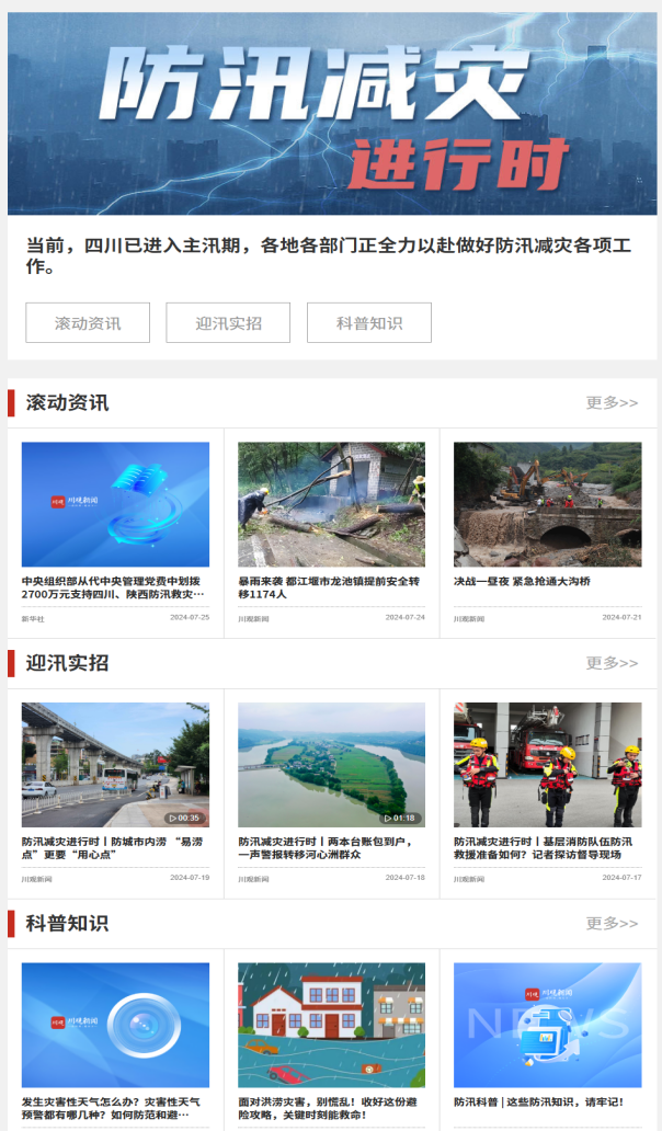 四川日报全媒体在宣传报道中始终不忘媒体人的责任,第一时间报道灾难及事故现场最新情况。深入汉源马烈乡、康定姑咱山洪泥石流等突发自然灾害事件现场,发回《转移村民 陡坡上搭起救援“人梯”》《挺进日地沟》等一线现场报道,用镜头和笔触回应社会关切,传递人民至上的救援精神。因时因势加强防灾减灾宣传引导,设“防汛减灾进行时”专题,推出《主汛期来了 四川防灾减灾抓这些重点》《这个神器让洪水预警至少提前一小时》等深度报道。