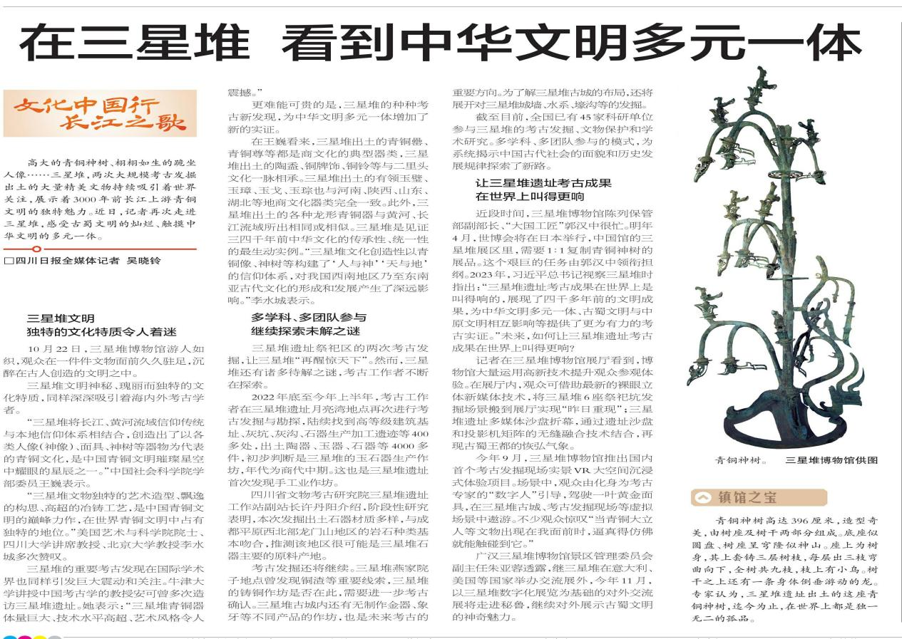 针对“提高主流舆论声量和影响,讲好巴蜀文化的新时代故事”,四川日报全媒体在重要节点推出多组专题和综述报道,展现四川文化强省建设新成果、新气象。《牢记总书记嘱托,文化传承发展奋楫扬帆—四川学习贯彻习近平文化思想一年间》综述报道,获中宣部领导肯定。开设“文化中国行”专栏专题,刊发文字、图片、视频、海报等报道469篇,全网总传播量超1.2亿。《眉山三苏祠博物馆:在一滴水里看见太阳》、《在三星堆 看到中华文明的多元一体》、《在宝墩遗址 看到4500年前成都平原的文明曙光》3篇报道获中国记协等推荐全网推送和转发,并入选中国记协第30期践行“四力”好作品“我的代表作”。
