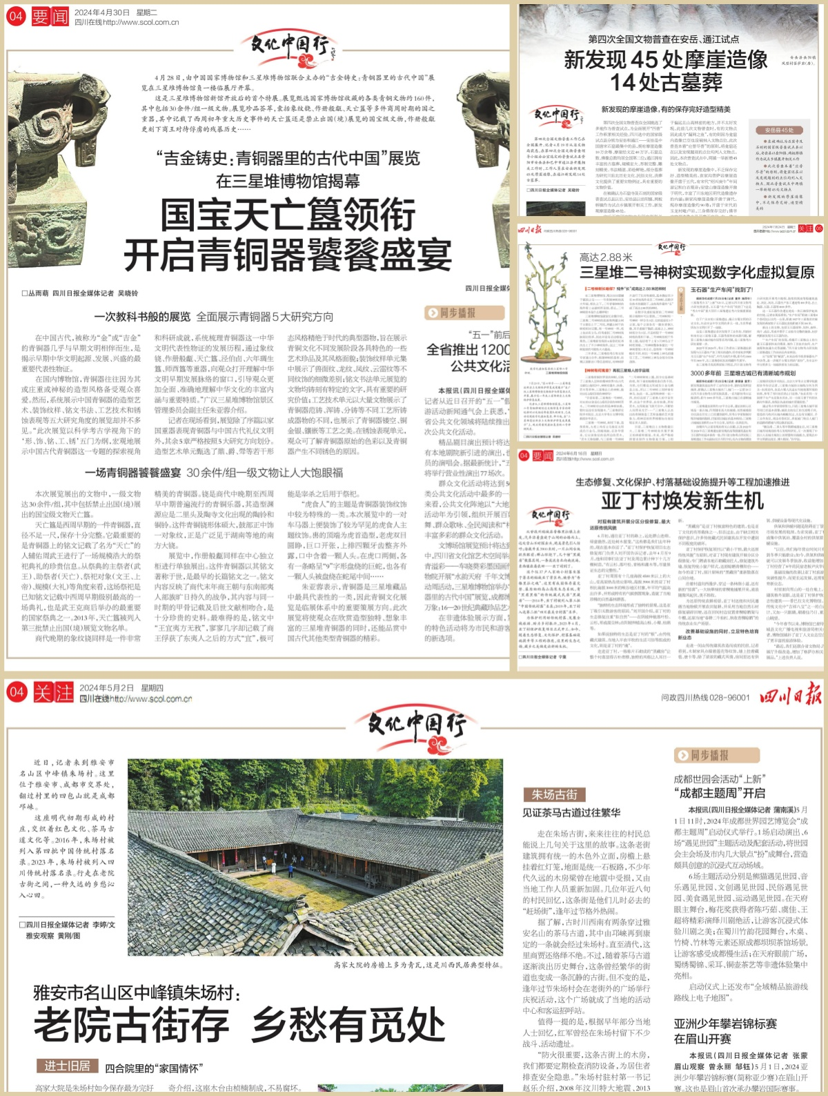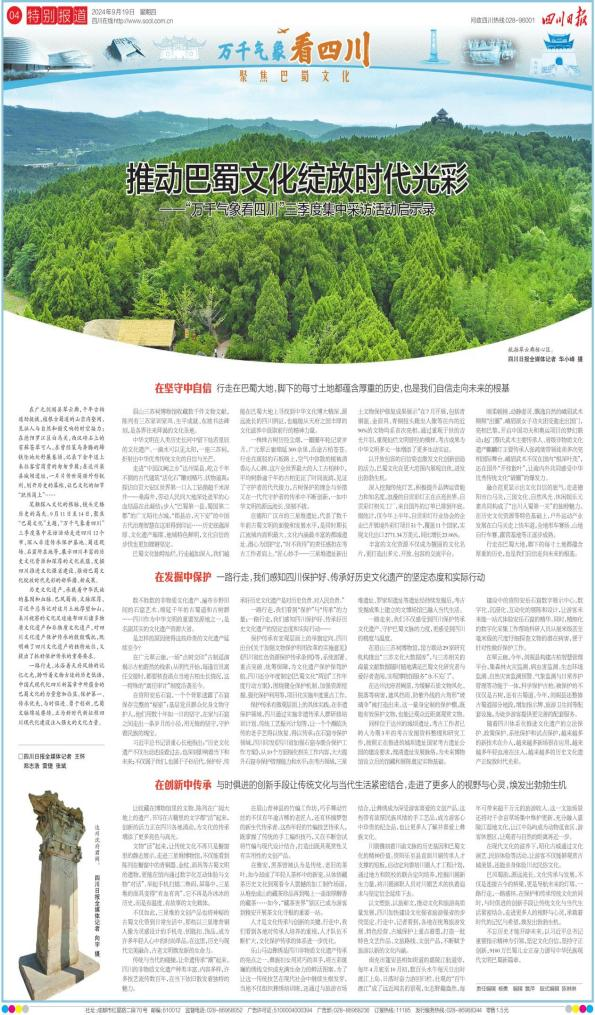 深入爱国教育基地、非遗传承保护地、古迹石窟地等,推出“万千气象看四川·聚焦巴蜀文化”主题采访,展示四川丰富的历史文化资源和深厚的文化底蕴。联动陕甘渝三省(市),启动“蜀道行”系列活动,拓展巴蜀文化影响力。持续创新开展“川观文学奖”系列活动;擦亮原创内容品牌。打造文博新名片,四川报业博物馆开馆运营,接待观众2万多人次,团队2200多批次,成为传媒新地标、传习新阵地。