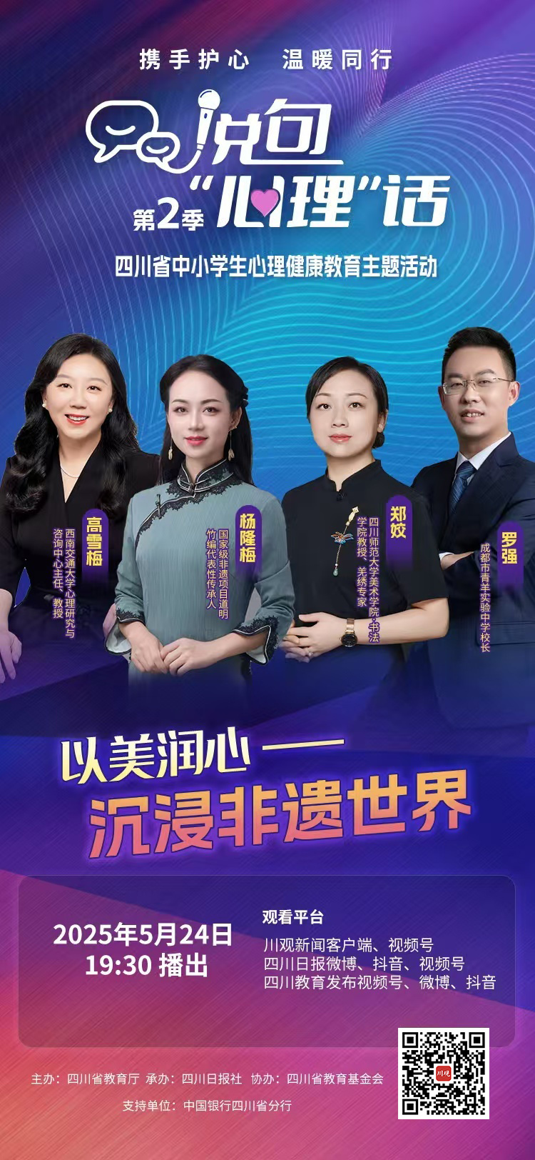 本周末(5月24日、25日),由四川省教育厅主办、四川日报社承办、四川省教育基金会协办、中国银行四川省分行支持的“说句‘心理’话——四川省中小学生心理健康教育主题活动”第2季精彩来袭。两堂视听课《以美润心——沉浸非遗世界》《以体强心——逐梦风火轮》将上线播出,5月24日19:30、25日19:30,观众可通过四川教育发布、四川教育电视台、川观新闻、四川在线、四川日报微博、抖音、视频号等渠道观看。