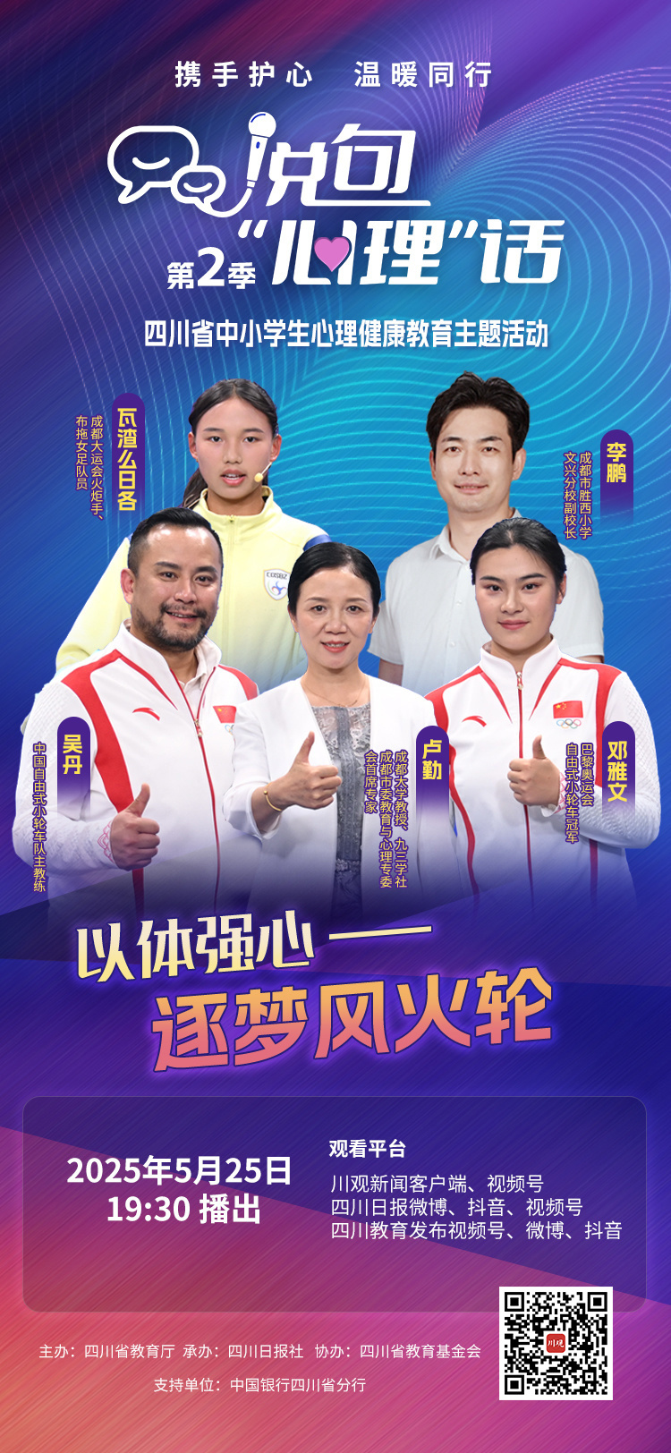 第二期《以体强心——逐梦风火轮》将于5月25日(周日)19:30播出。主讲嘉宾将带领学生走进竞技体育的赛场,对话巴黎奥运会冠军、布拖女足队员,了解闪耀金牌的背后冠军们成长的故事,感悟体育之光照亮生命的旅程,以更加积极的姿态拥抱未来。本期节目将深入剖析“勇敢”“坚毅”“悦纳”等积极心理品质的内涵意义。