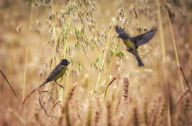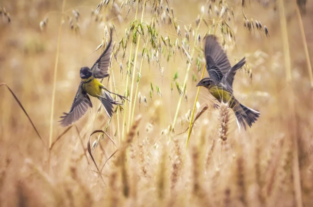 今年5月初,初熟的麦子正在泛黄。罗成德来到黄水镇的花田里·禾町,端起相机“打鸟”。守了好几天,他守到了黄胸鹀。10秒间,两只黄胸鹀从紧紧抓住野燕麦的茎,到飞翔,再消失在麦田。罗成德的相机咔咔作响,抓拍下了它们双宿双飞的画面。