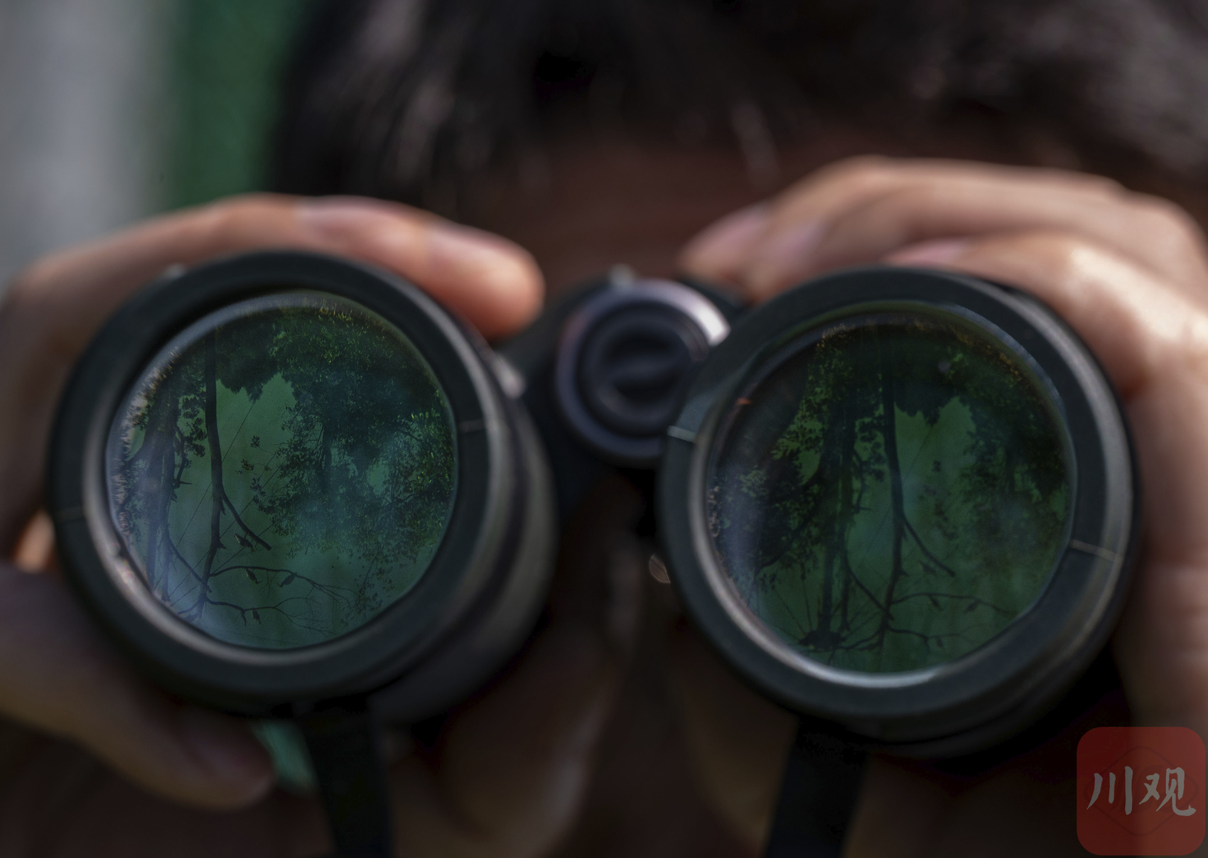 2025年5月19日,乐山市沐川县沐川朱鹮繁育中心,科研人员用望远镜观察树上的朱鹮情况。