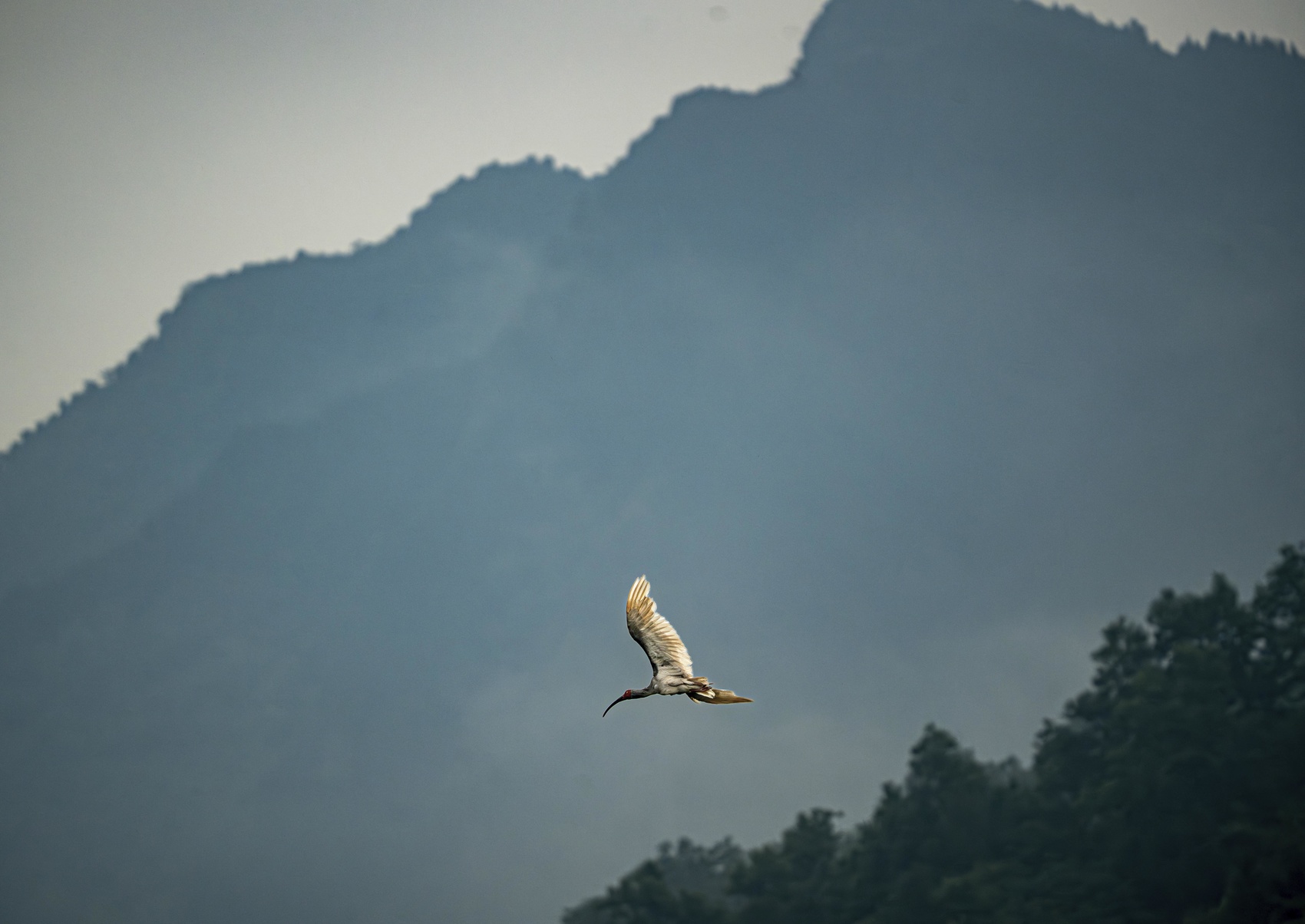 2025年5月22日,一只放飞的朱鹮飞向大山。