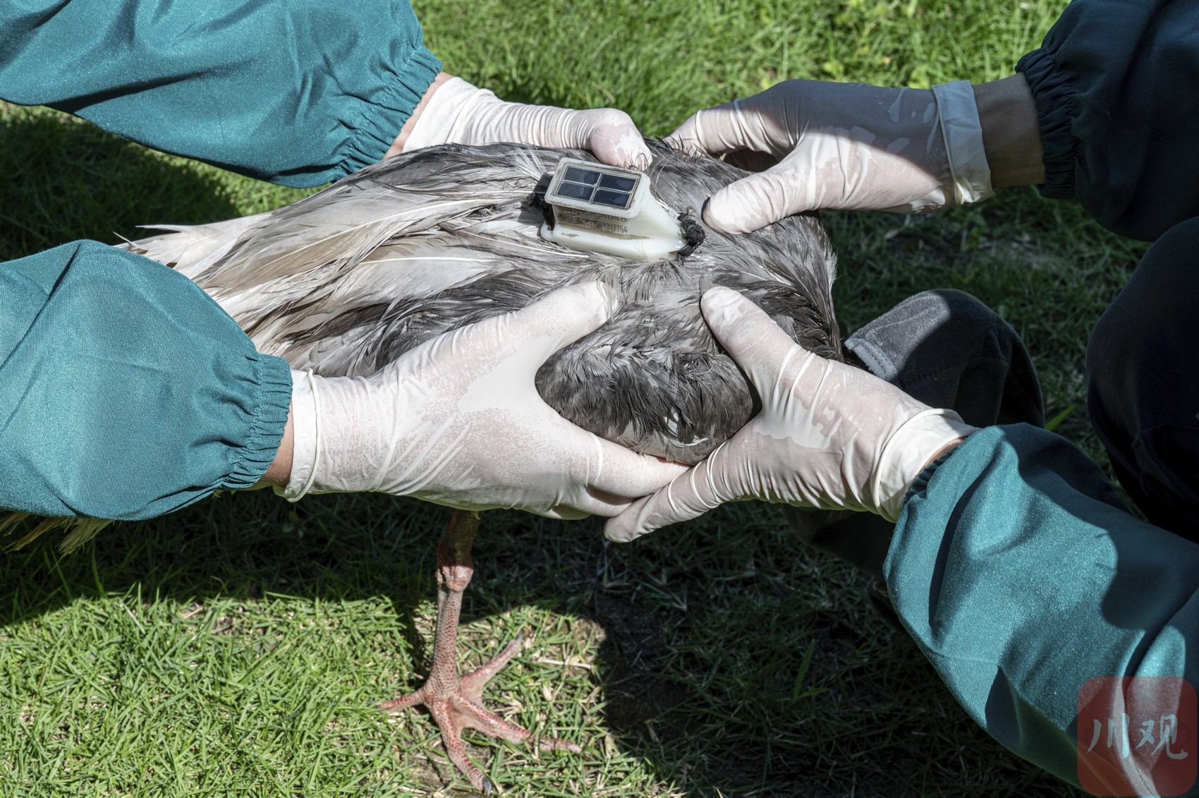 2025年5月19日,乐山市沐川县沐川朱鹮繁育中心,科研人员给准备放飞的朱鹮安装北斗卫星定位器。