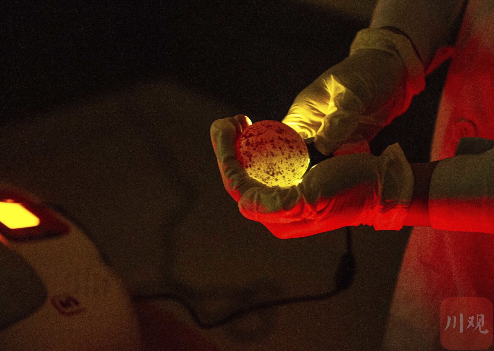 2017年4月17日,峨眉山生物资源实验站朱鹮驯养繁殖研究基地内,科研人员用灯光照射鸟蛋,观察朱鹮胚胎发育情况。