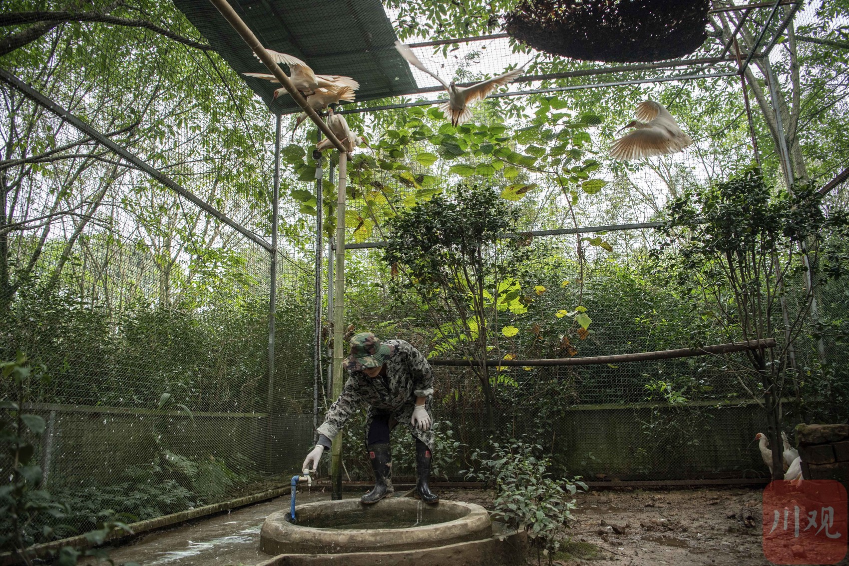 2019年10月16日,峨眉山生物资源实验站内,科研人员正在清扫朱鹮的笼舍。