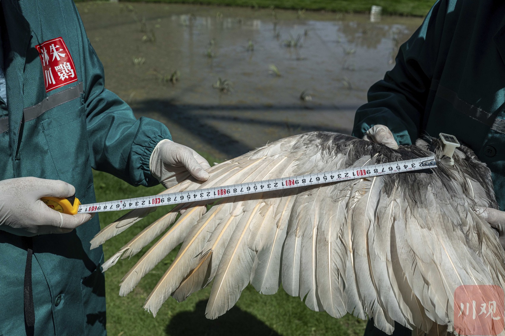 2025年5月19日,乐山市沐川县沐川朱鹮繁育中心,科研人员用测量野化培训的朱鹮翅膀长度。