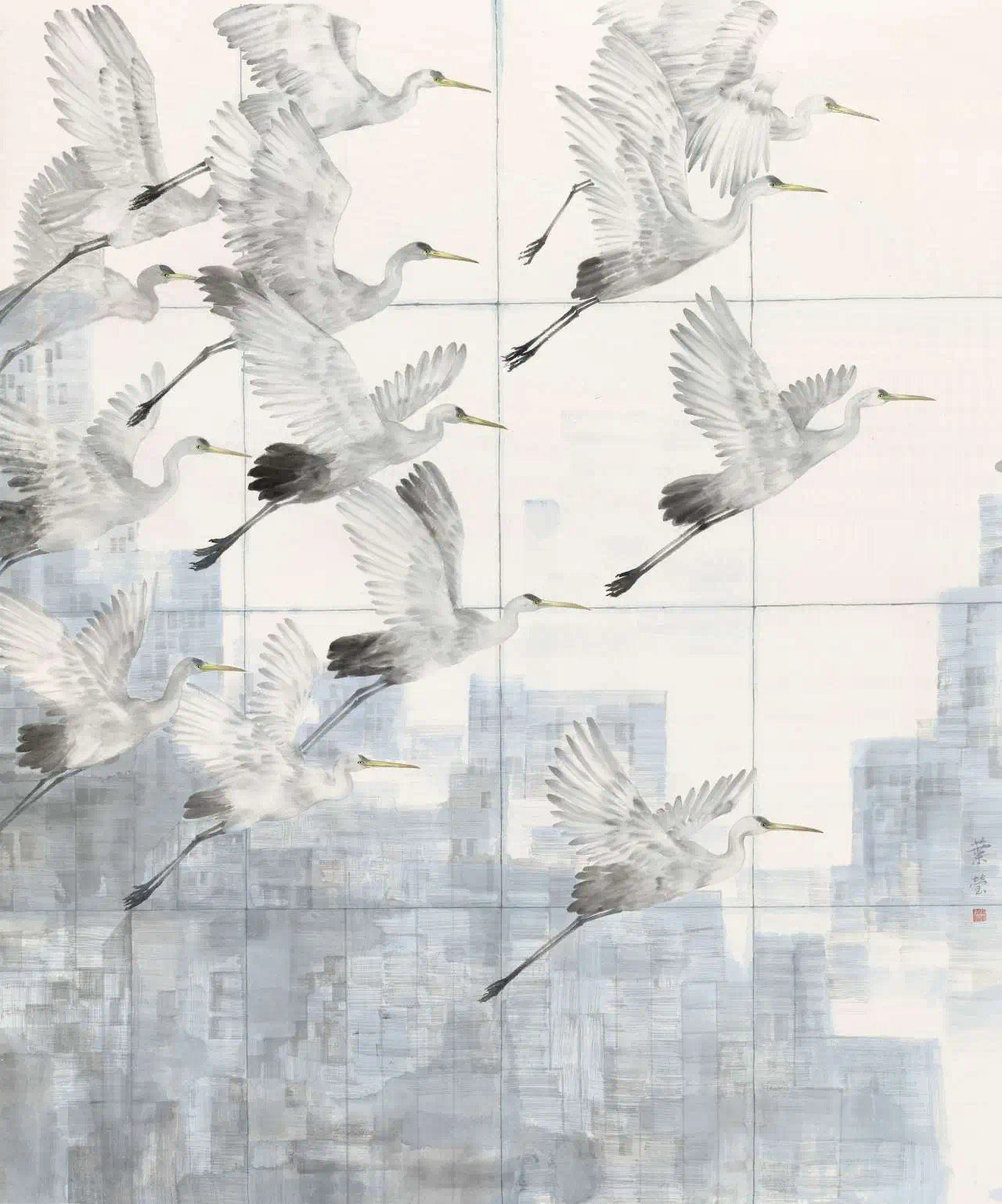 四川画家叶莹的作品,展现了一个没有烦恼纷争的艺术世界,与现实世界拉开距离。作品中,中国画的媒介和手法使其笔之所至,流淌着如水般的东方灵韵,透露着一种沉静之美。她的作品多以工笔画见长,精细描绘、层层烘染,好像在摩挲时间的肌理。在她笔下,无论草木花鸟,都不是对现实事物简单的摹写,而是在保持基本形象的基础上,注入画家的主观情思,从而成为一种具有超越性的精神意象。这幅《又见鹭影归》,以虚化的城市楼宇为背景,突出鹭群振翅奋飞、凌空而上的生动情态,氤氲的气氛、柔化的线条、淡雅的色彩,给观者以充分的遐想空间。