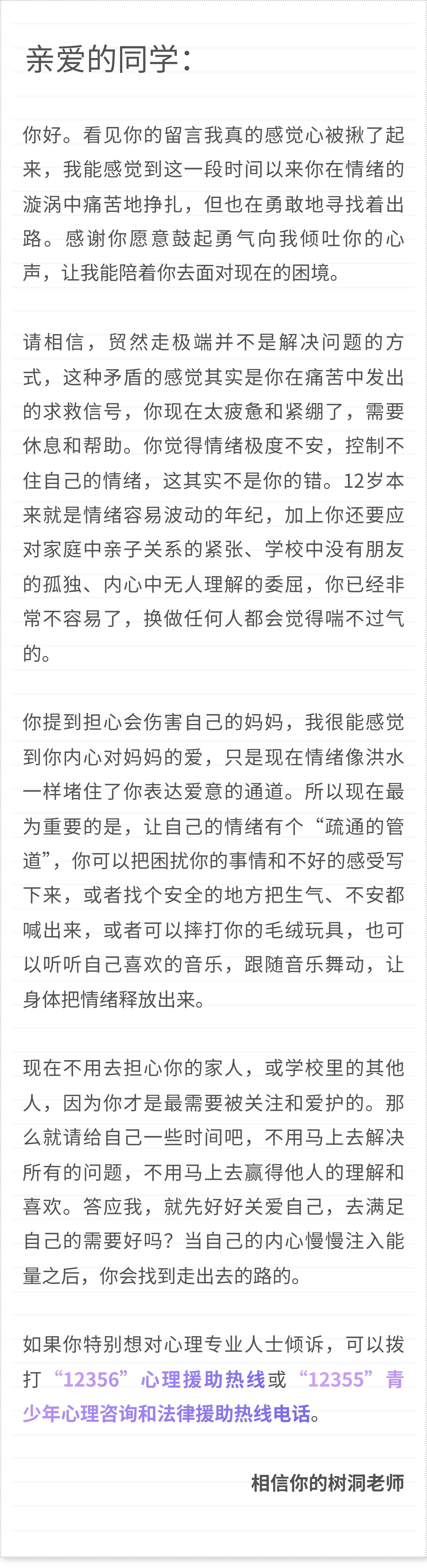 一位12岁小学女生:不知道为什么最近我情绪极度不安,现在我们家里的关系又有一点紧张 ,我真的很担心,甚至产生了一些极端的想法。