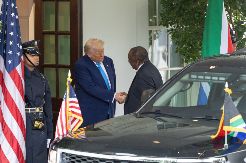 5月21日,美国总统特朗普(左二)在华盛顿白宫迎接到访的南非总统拉马福萨。