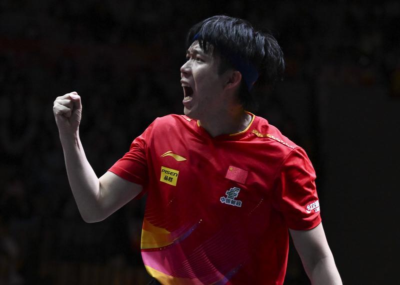 5月22日,王楚钦在比赛中庆祝得分。新华社记者 贺长山 摄