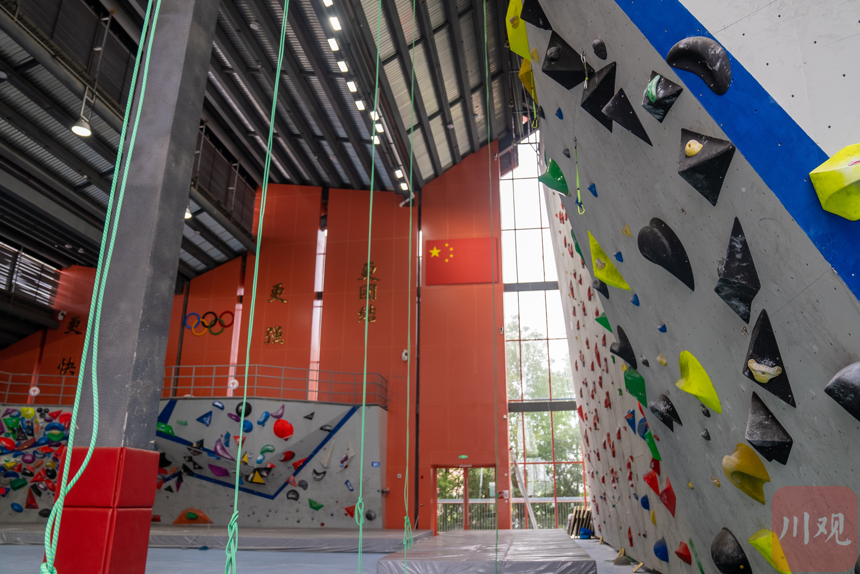想打卡另一个能承接国际A级赛事的攀岩馆,必须先攀上校园里的虎丘。和游泳馆很像,这里也是室内和室外场地相结合的一座馆。攀岩教练朱昌华表示,这座钢结构场馆建筑高度19.20米,可进行速度攀岩、抱石攀岩和难度攀岩三大项目比赛。“看起来好难哦,简直无处下脚。”“其实,每个岩点的形状、角度和距离都是经过精心测算的。攀岩被称为‘墙壁上的芭蕾’,我们总把目光聚焦到攀岩者身上,但岩壁下的保护员绝不能轻视,他们是攀岩者生命安全的护航者。”