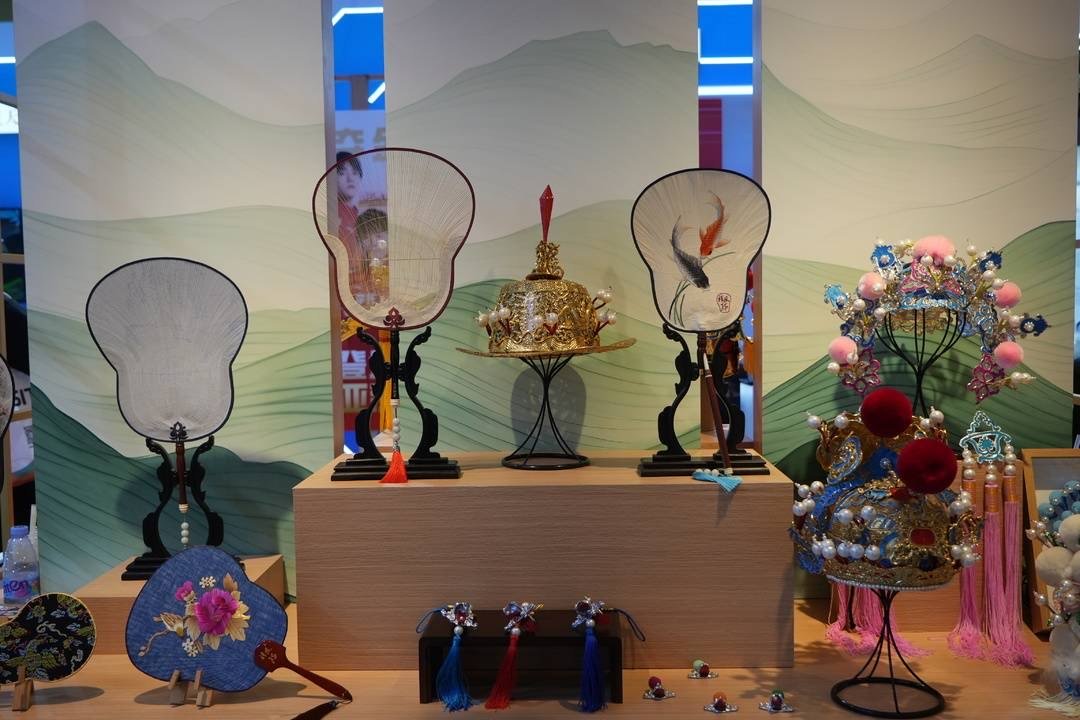 在非遗文创区,省级非遗德阳潮扇与川剧盔帽在展柜中熠熠生辉。6把造型各异的潮扇令人目不暇接——山水水墨扇以淡雅笔触勾勒千里江山,蜀绣连笔扇将蜀绣与内置毛笔结合,兼具艺术与实用价值;4顶川剧盔帽更是引得戏曲爱好者连连称奇,扮演岳飞专用的岳盔金光闪耀,蟠龙图案栩栩如生,绝迹舞台的“伴驾”盔帽以翠凤珠花重现宫廷华贵。“第一次近距离看到这么精美的川剧盔帽,每个细节都充满故事!”深圳市民李女士边说边举起手机拍摄。工作人员现场讲解潮扇编织与盔帽制作工艺,近看竹丝翻飞、金箔贴饰的非遗作品,围观人群不时发出阵阵惊叹。