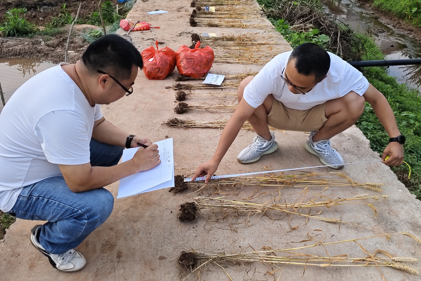 测产团队正在记录小麦株高、穗长等数据。