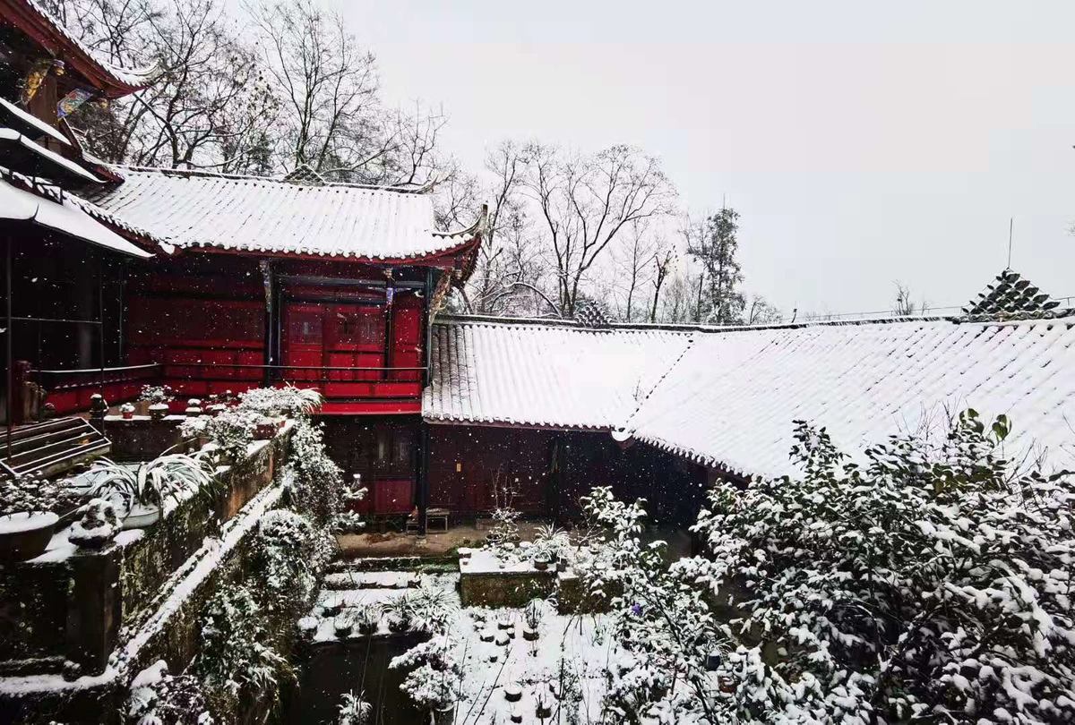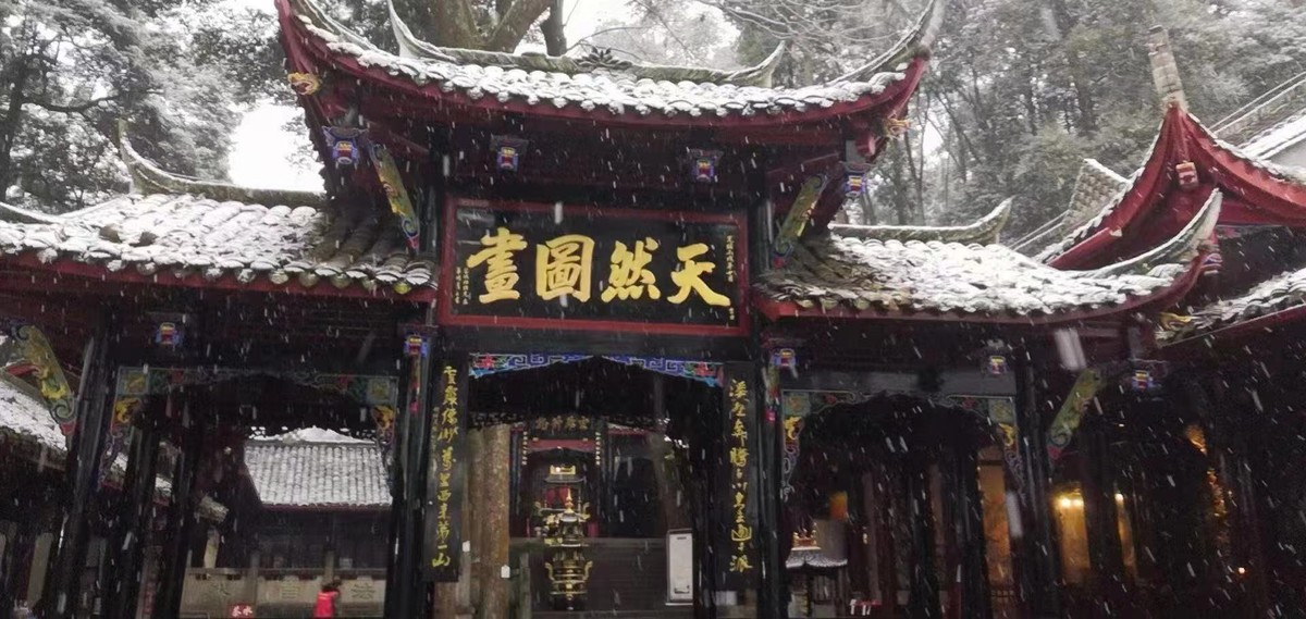 青城山天然图画、五洞天、月城湖、天师洞等景点全部被皑皑白雪覆盖,青城山呈现出平常少有的银装素裹之美。